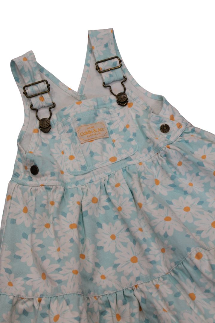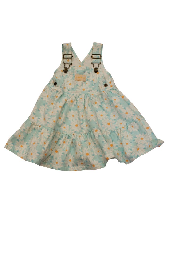 Celebrate sunny days in this delightful bib and brace overall dress, featuring a cheerful daisy print that brings joy to playtime. Constructed from 100% cotton, it's breathable and gentle on sensitive skin, perfect for warm weather wear. The classic overall silhouette provides practical pockets and adjustable straps for a secure, comfortable fit as your toddler moves and plays. The timeless daisy design pairs effortlessly with any top, making this dress a versatile addition that transitions beautifully from season to season. Very good condition.