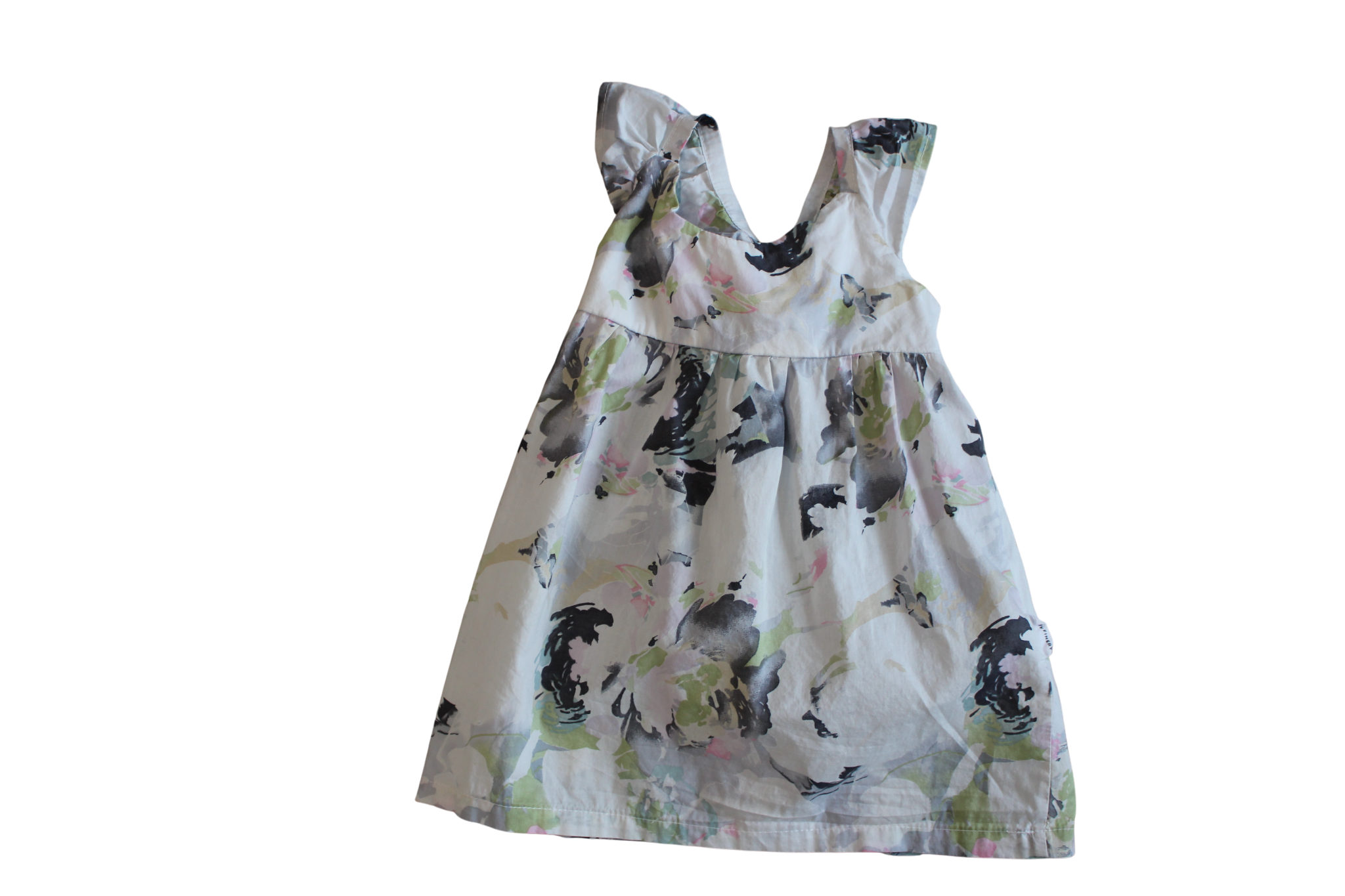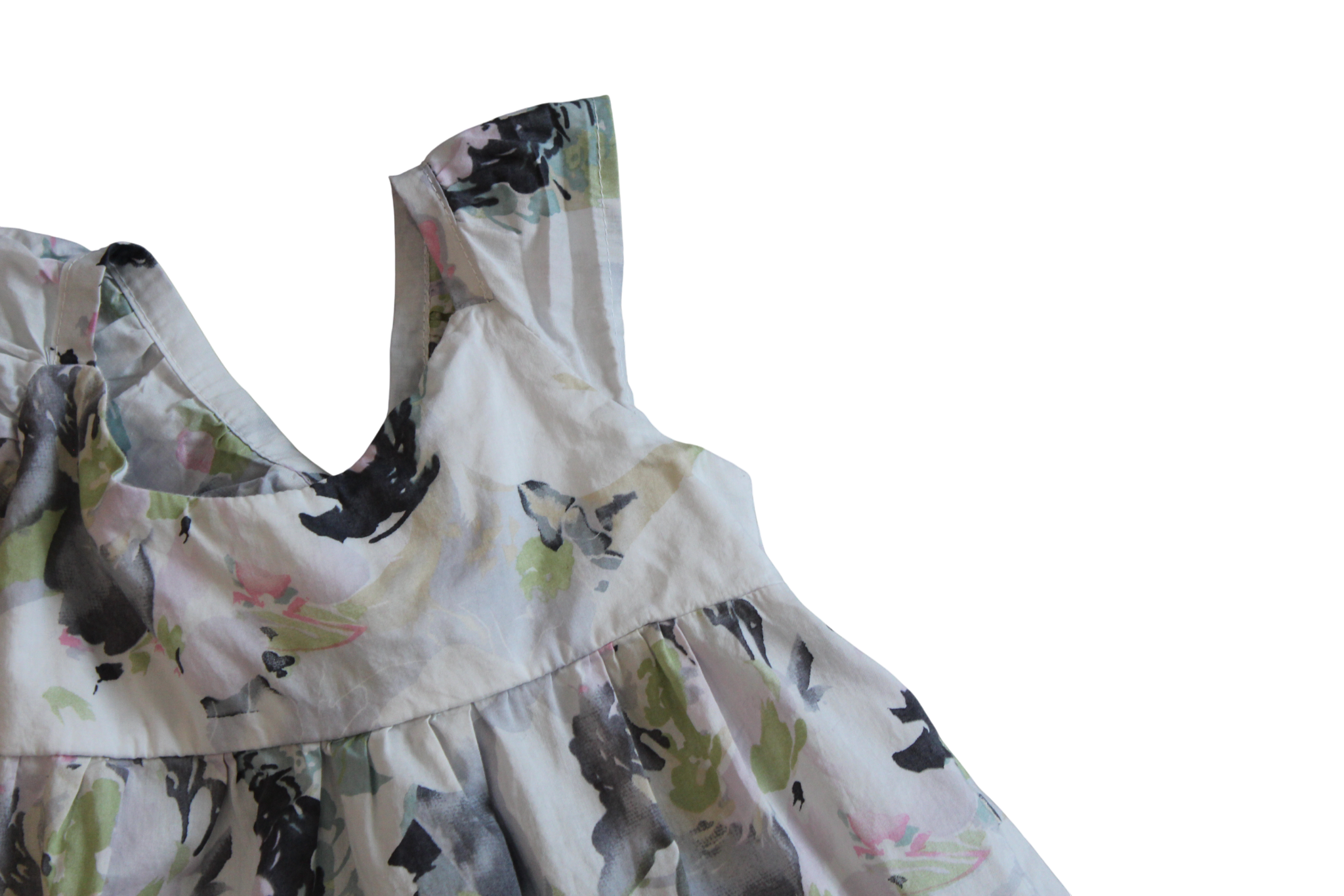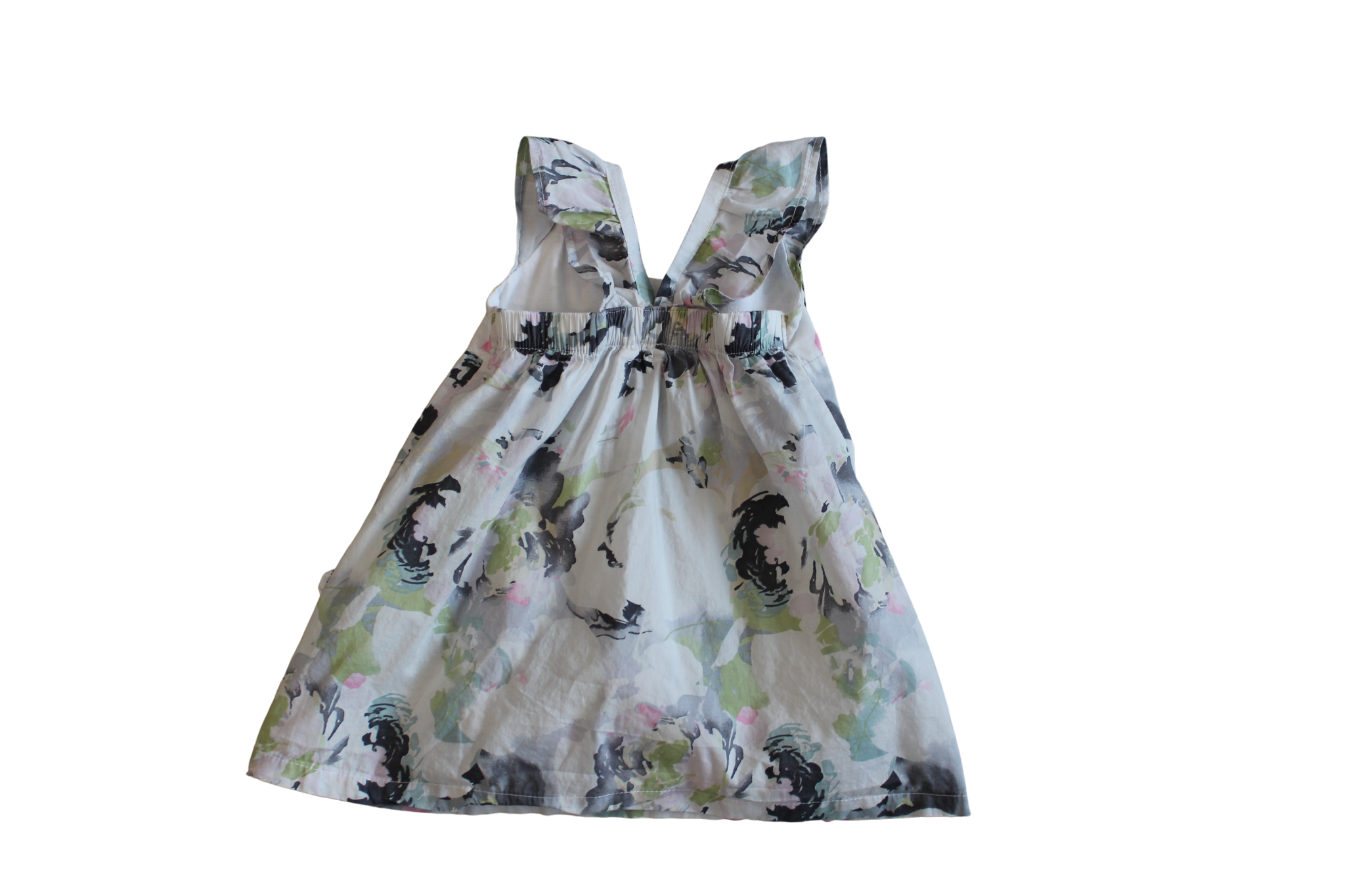 lightweight Crossed back frill tank dress. Gathered waistline and elastic band for adjustable comfy fit. Watercolour style soft print in deep greys, pink and green. .