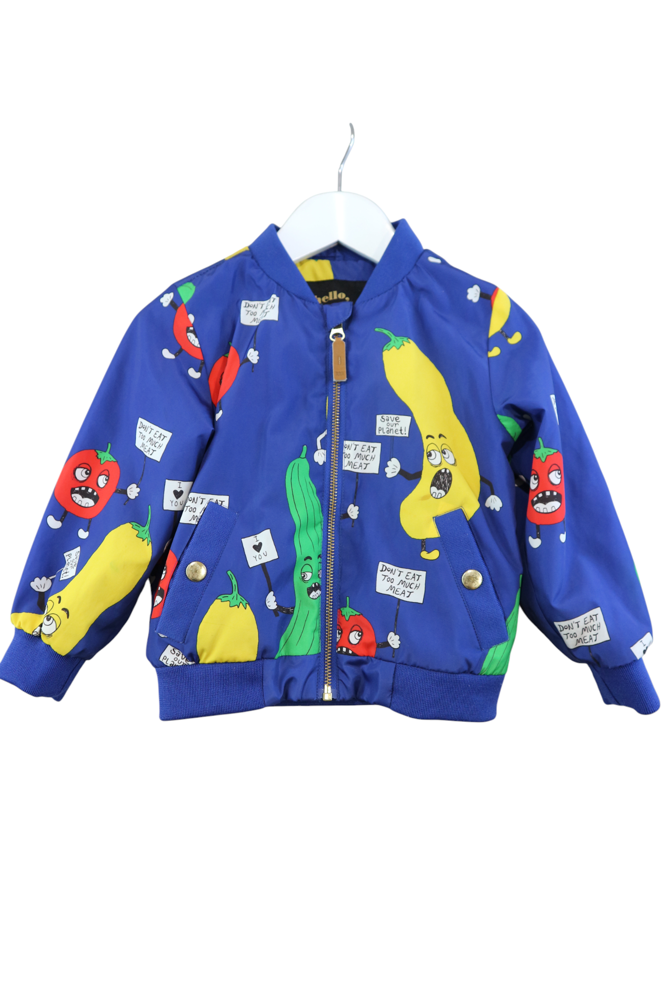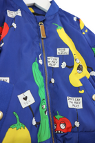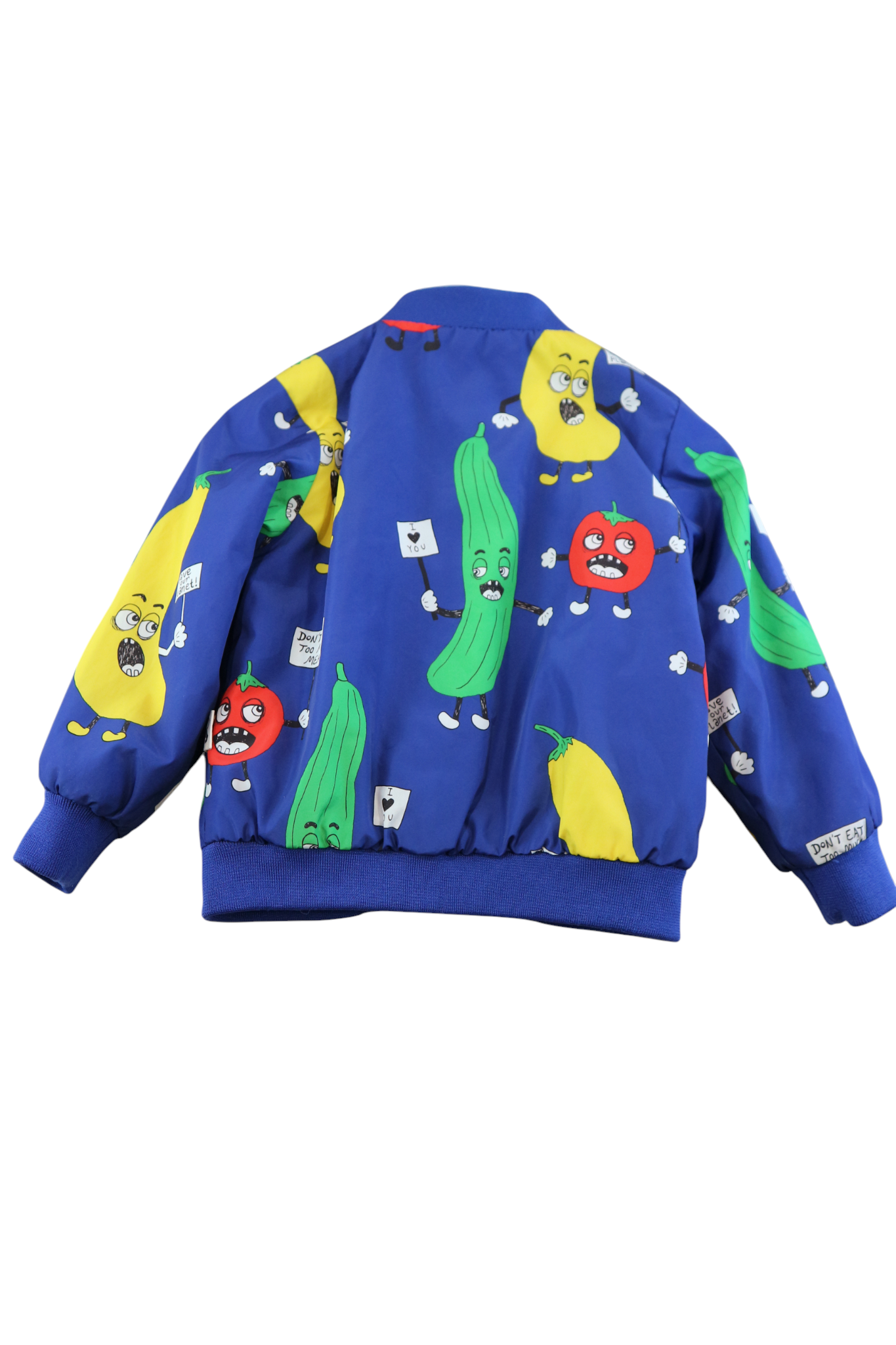 Mini Rodini blue bomber jacket with all over fruit and veggie print, size 92/98 (2-3yrs). Polyester.
