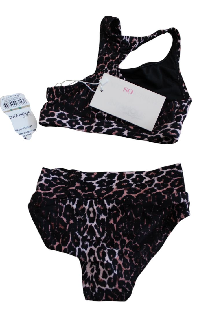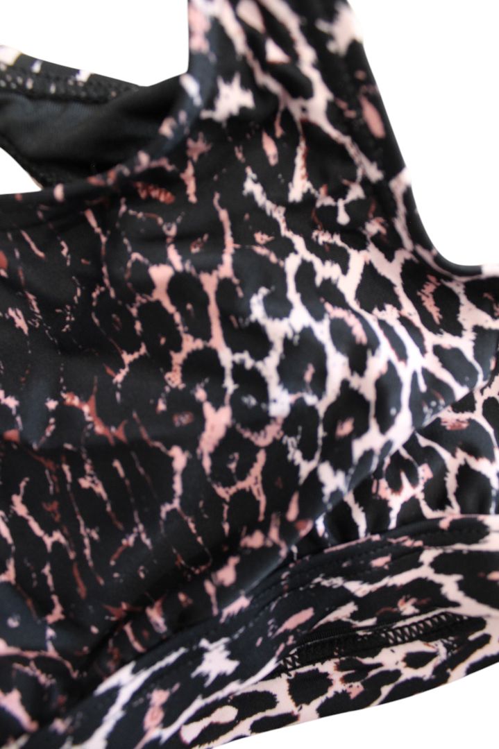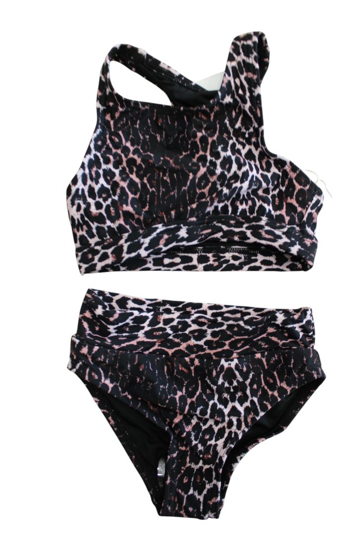 Two-piece grey leopard print toddler swimwear. Racerback style. Polyamide/spandex blend. New with tags!