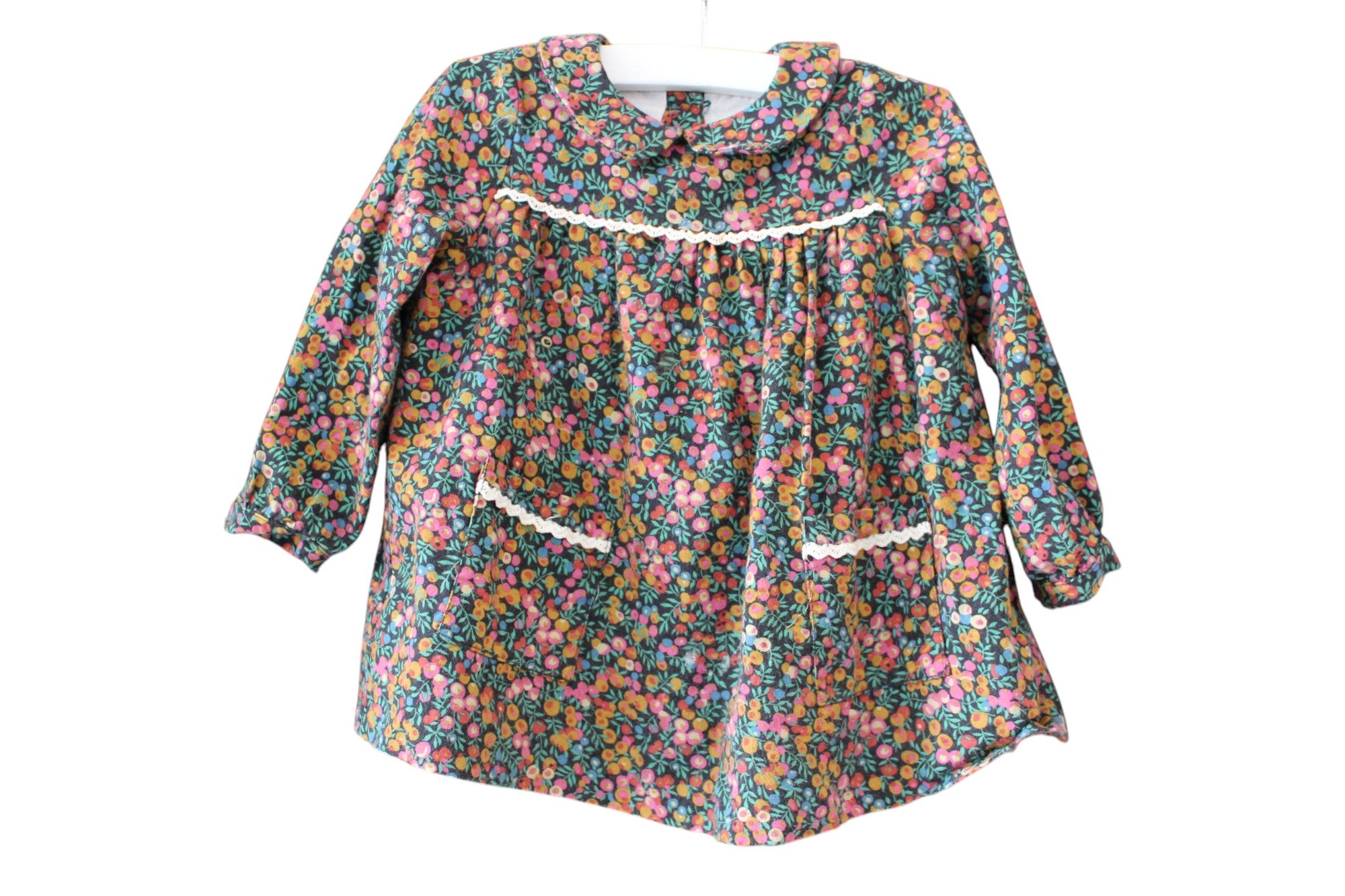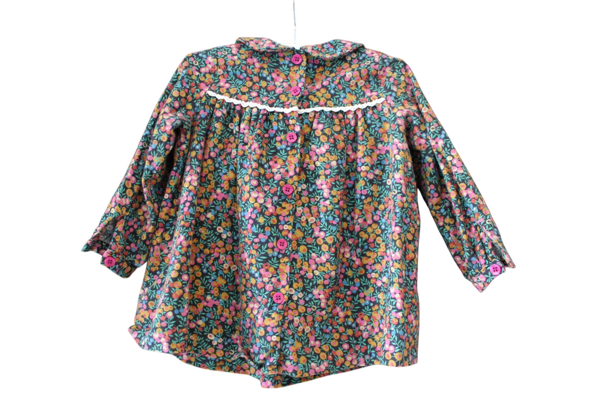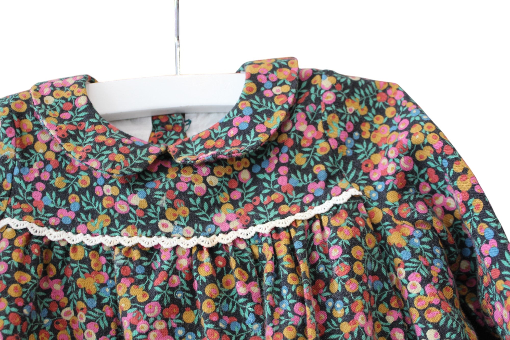 Long sleeve Peter Pan collar dress perfect for a speical occasion. Two front patch pockets and buttoned opening down the full back for easy dressing. Well-made with lining and sleeve buttons to add to the beautiful textile print.