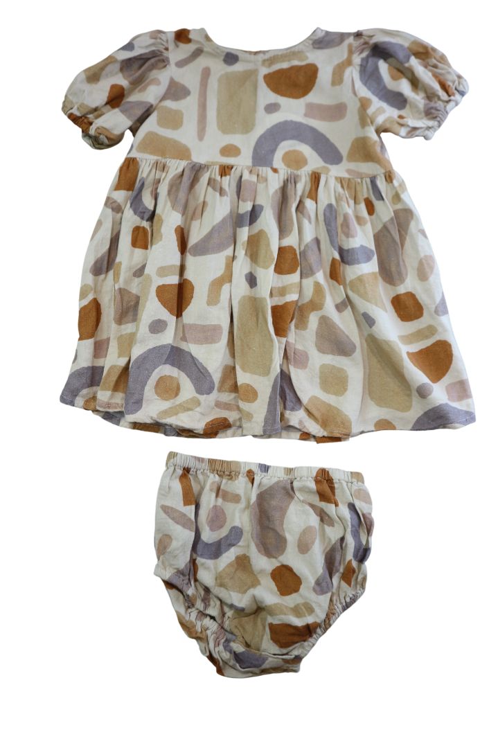 Say hello to the sweetest outfit combo! This charming Rylee & Cru Dress features a delightful beige base with playful shape prints that'll have your little one looking absolutely adorable. Sized perfectly for 18-24-month-olds, it comes complete with matching bloomers for extra cuteness and practical coverage during all those wiggly moments. The soft fabric keeps your toddler comfy all day long, whether they're exploring, playing, or snuggling up. Pure joy in every wear! Good preloved condition.