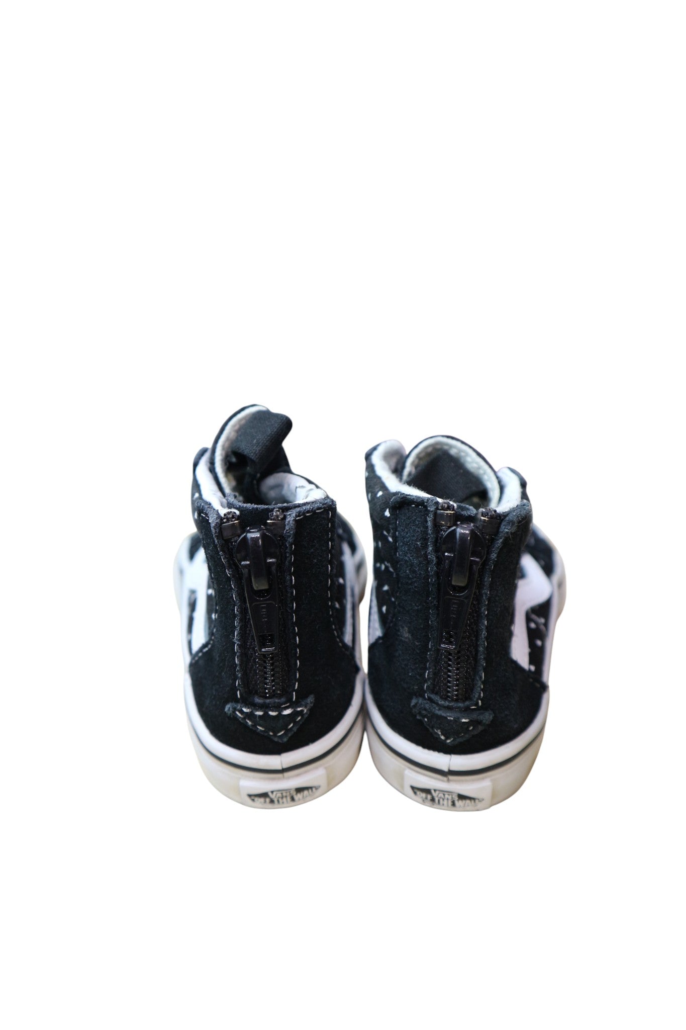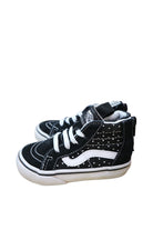 Step up your toddler’s style with these playful black and white Vans high tops. Featuring easy back zips and elastic faux laces, they’re perfect for little feet on the go—easy to slip on and stay snug. Durable and cool, these shoes make every tiny adventure more fun! Size 6 US.