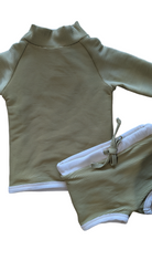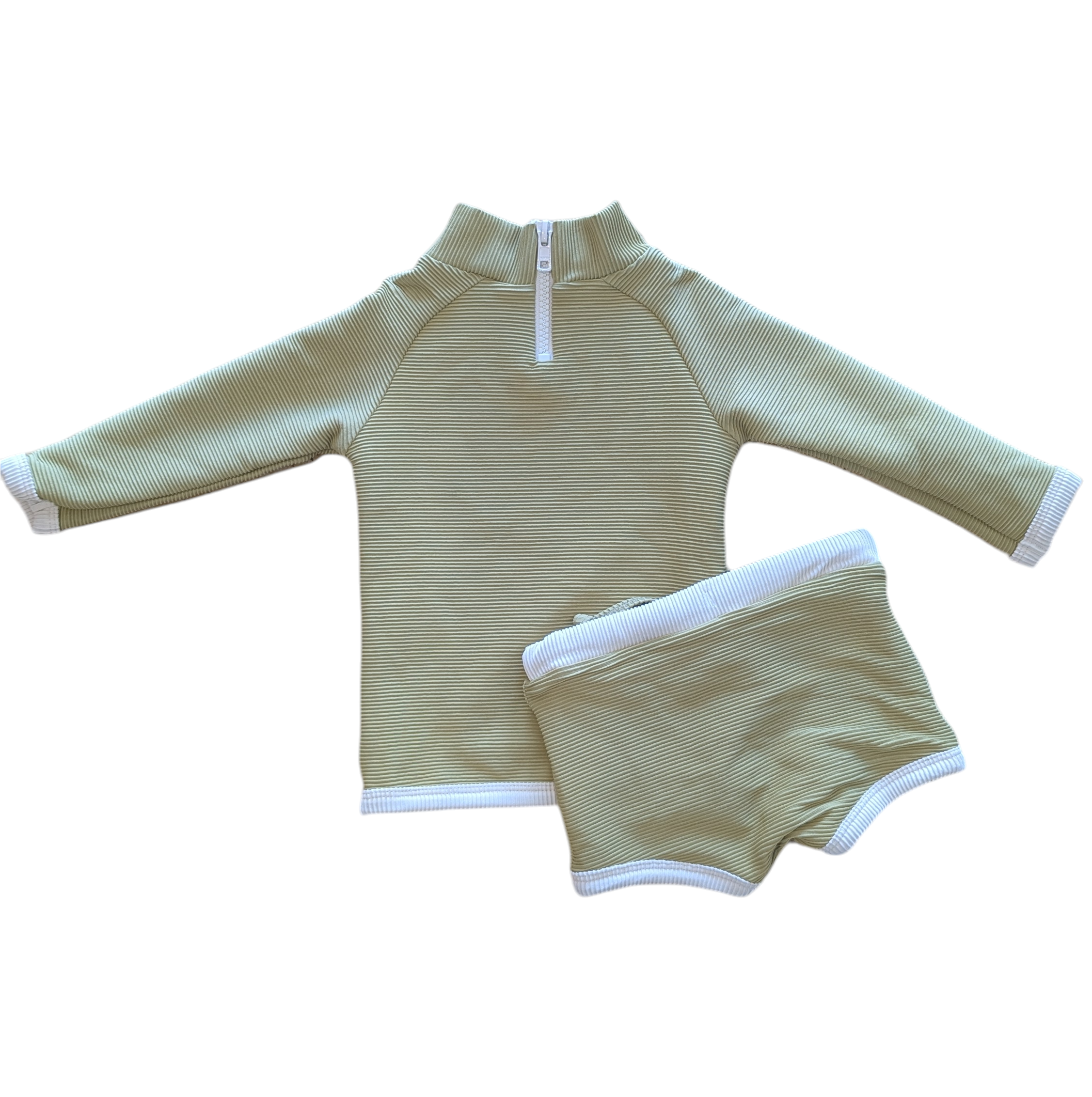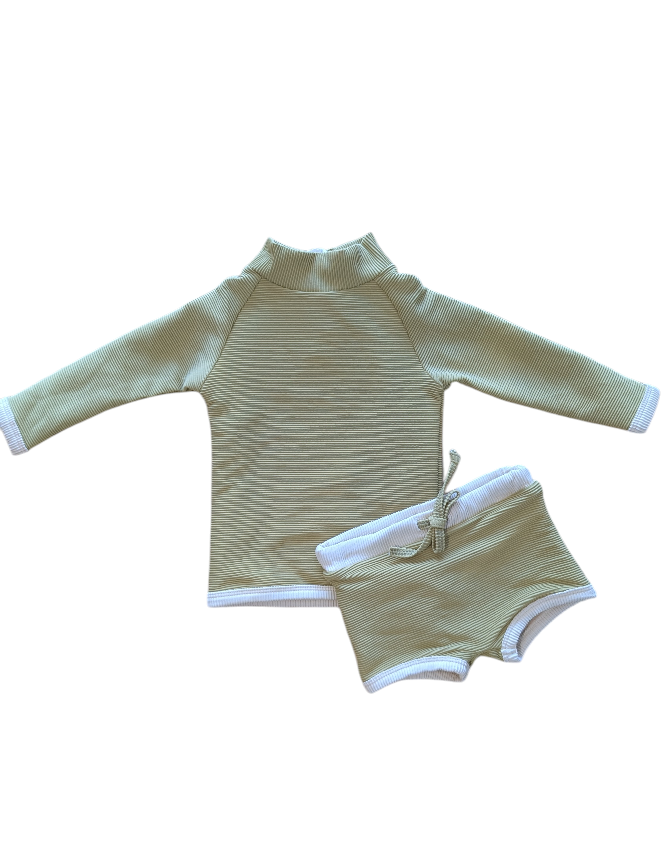 The Ribbed Rashie set by Zulu & Zephyr features a long sleeve, ribbed style rashie and shorts bottoms with contrast ribbed bands. The top has a zipper entry for easy access and the stretchy fabric makes changing while wet easier than ever! These swimmers are UPF50+ for sun protection.