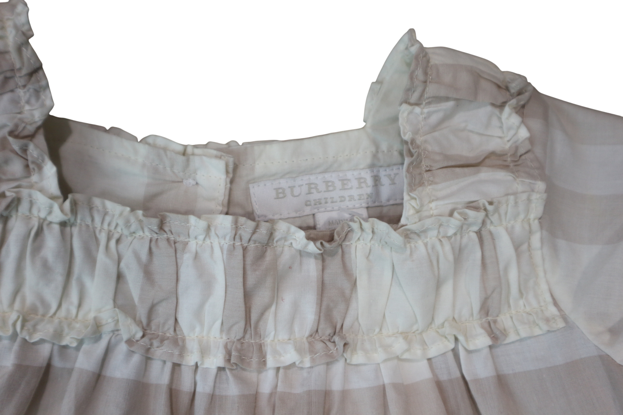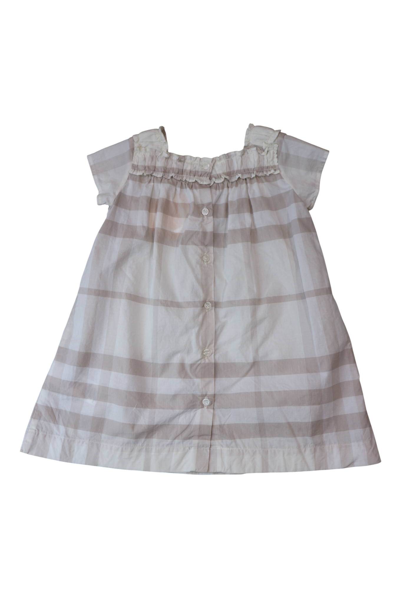 Grab this stunning wide check cream and brown Burberry dress. Square gathered neckline detail front and back. Six complete openings in the back for easy dressing. Wide hem and back vent to complement the aline loose fit.