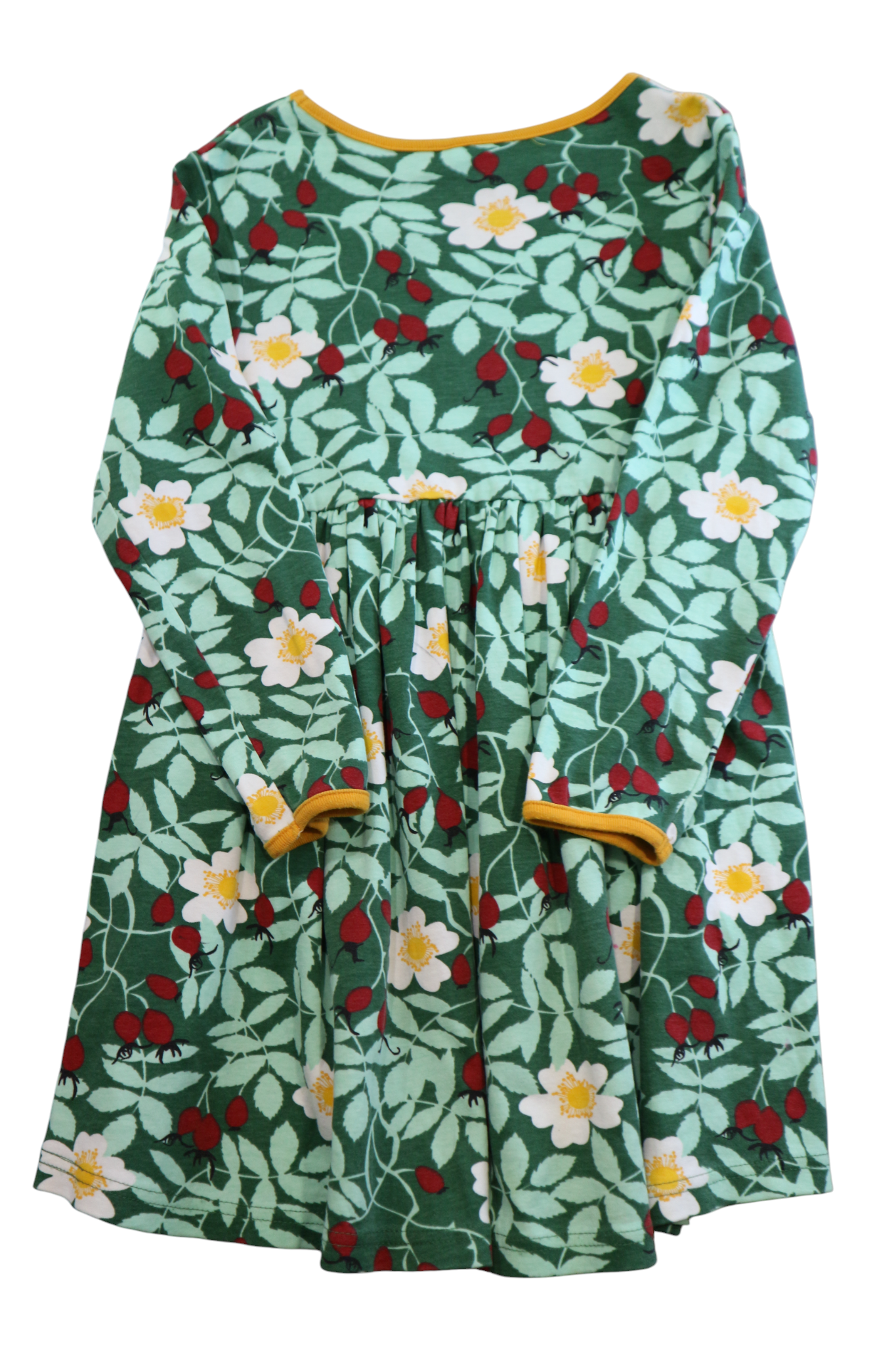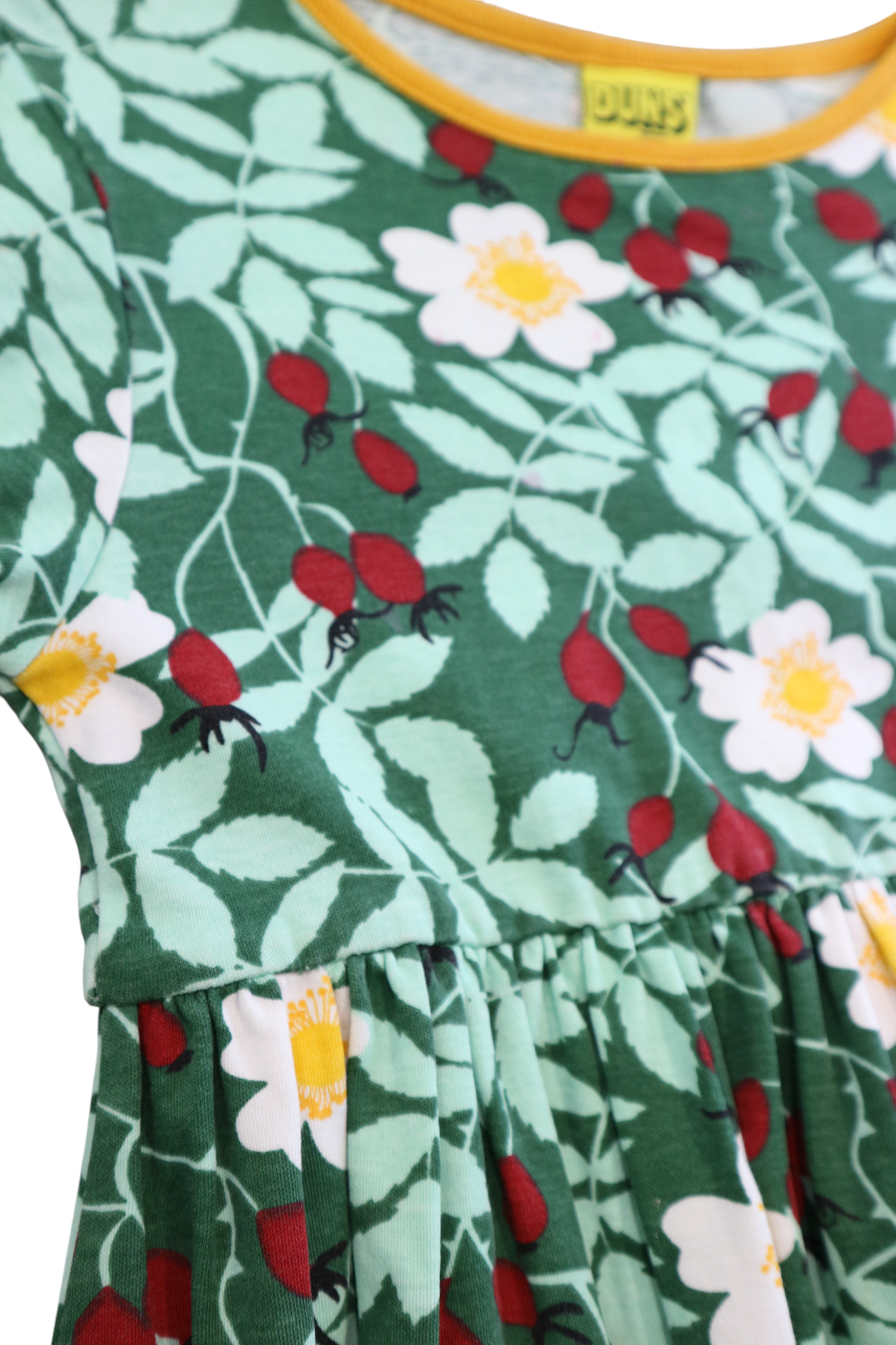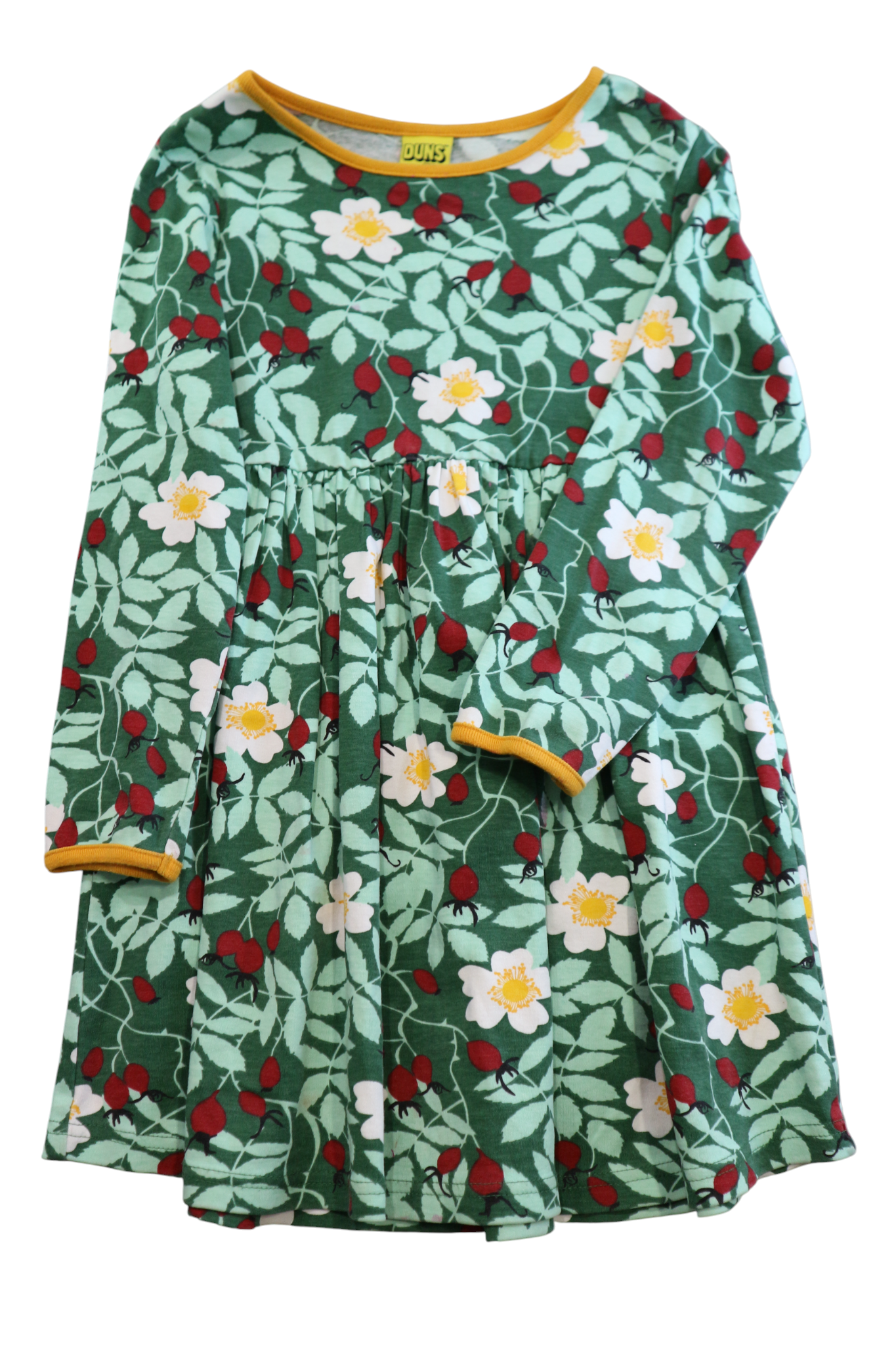 DUNS long-sleeved swing dress in green with floral print, size 122 (8yrs). 100% GOTS organic cotton.