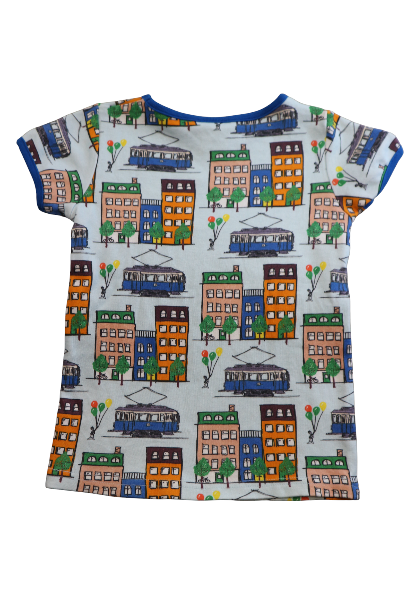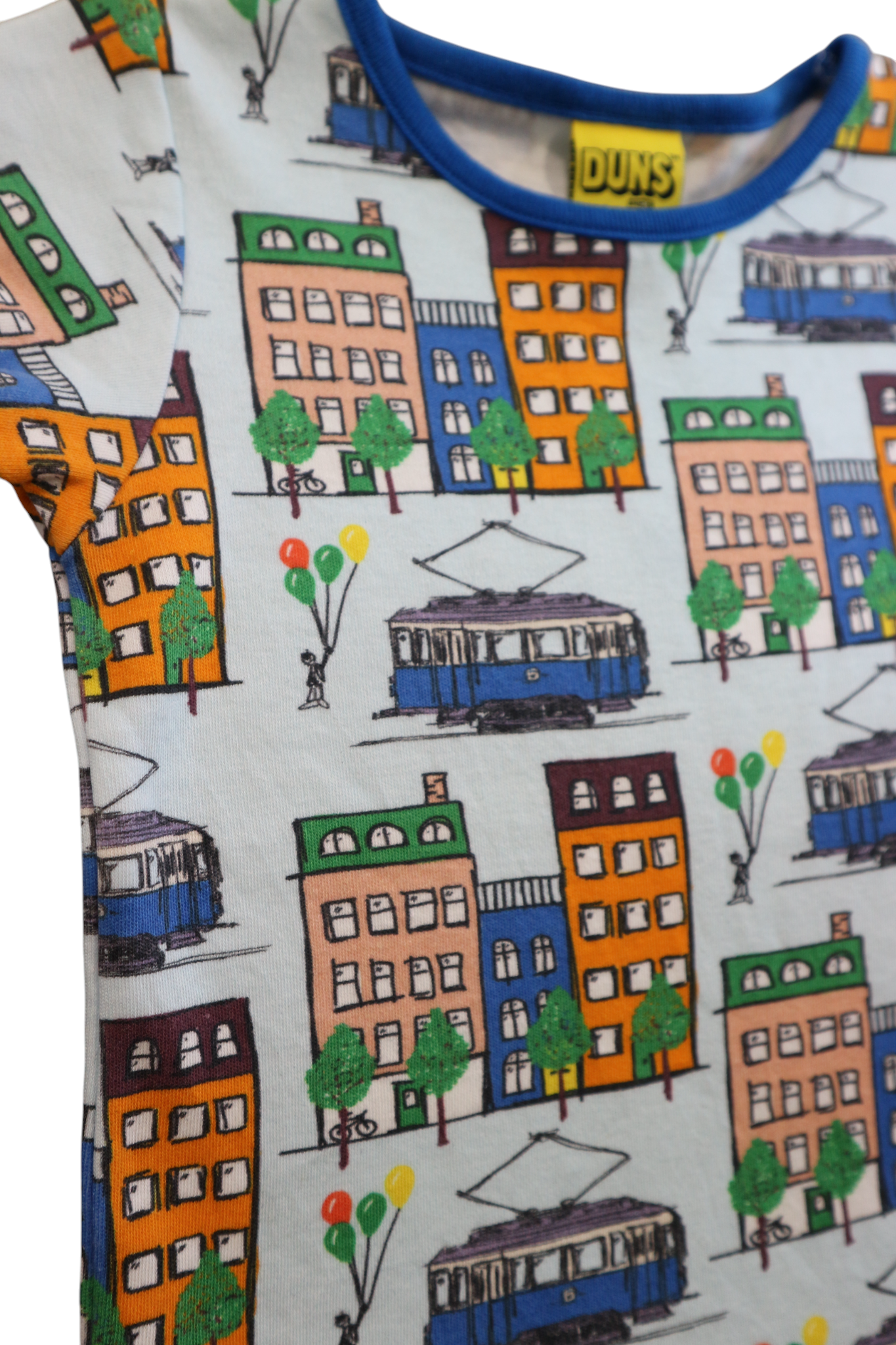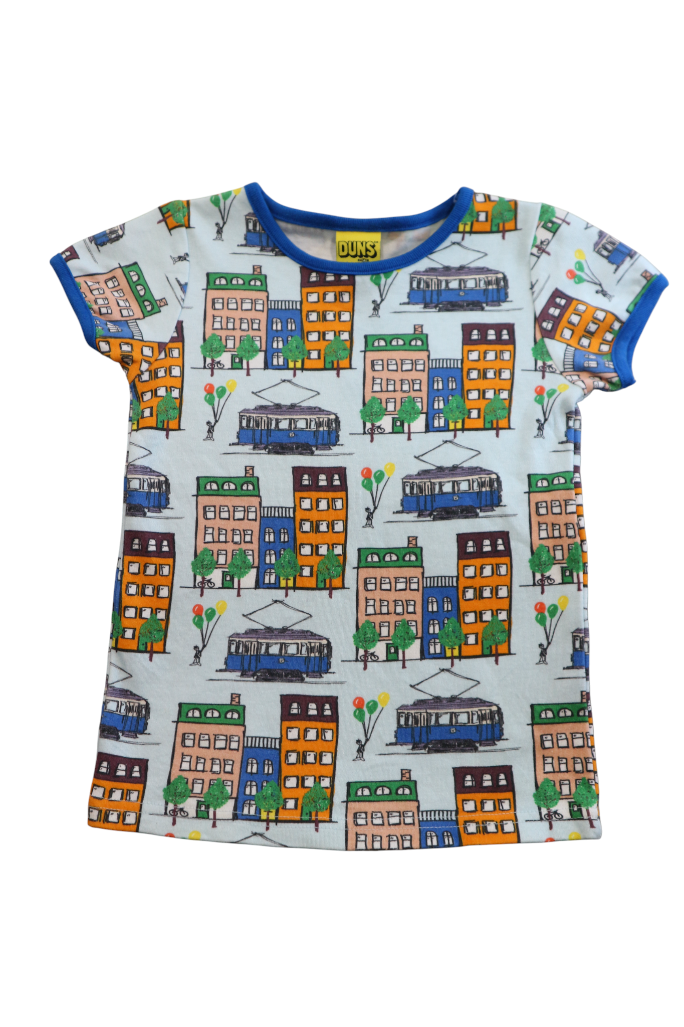DUNS t-shirt in blue with all-over city print, size 110 (4-5yrs). 100% GOTS organic cotton.