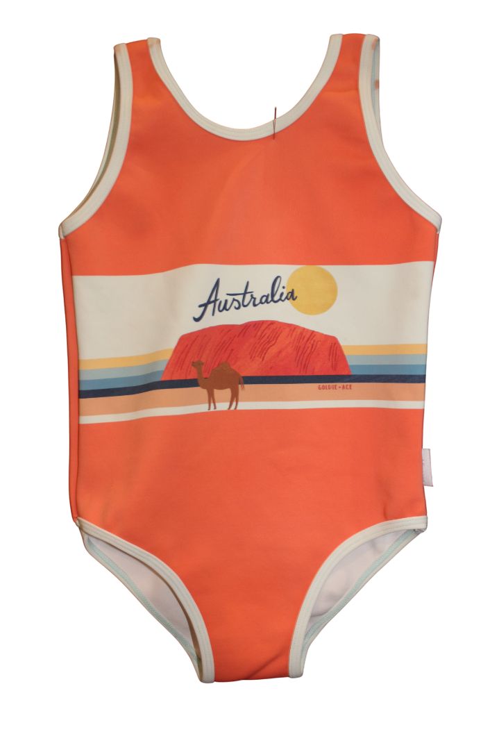 Dive into summer with this eye-catching one-piece swimwear featuring a stunning orange Uluru print! Bold, colourful, and full of character, it's designed to keep up with splashing, swimming, and sun-soaked adventures. The vibrant design celebrates iconic Australian landscapes while giving kids confidence and comfort in the water. Ready for the beach, pool, or backyard fun! Some marks on the contrast trim.