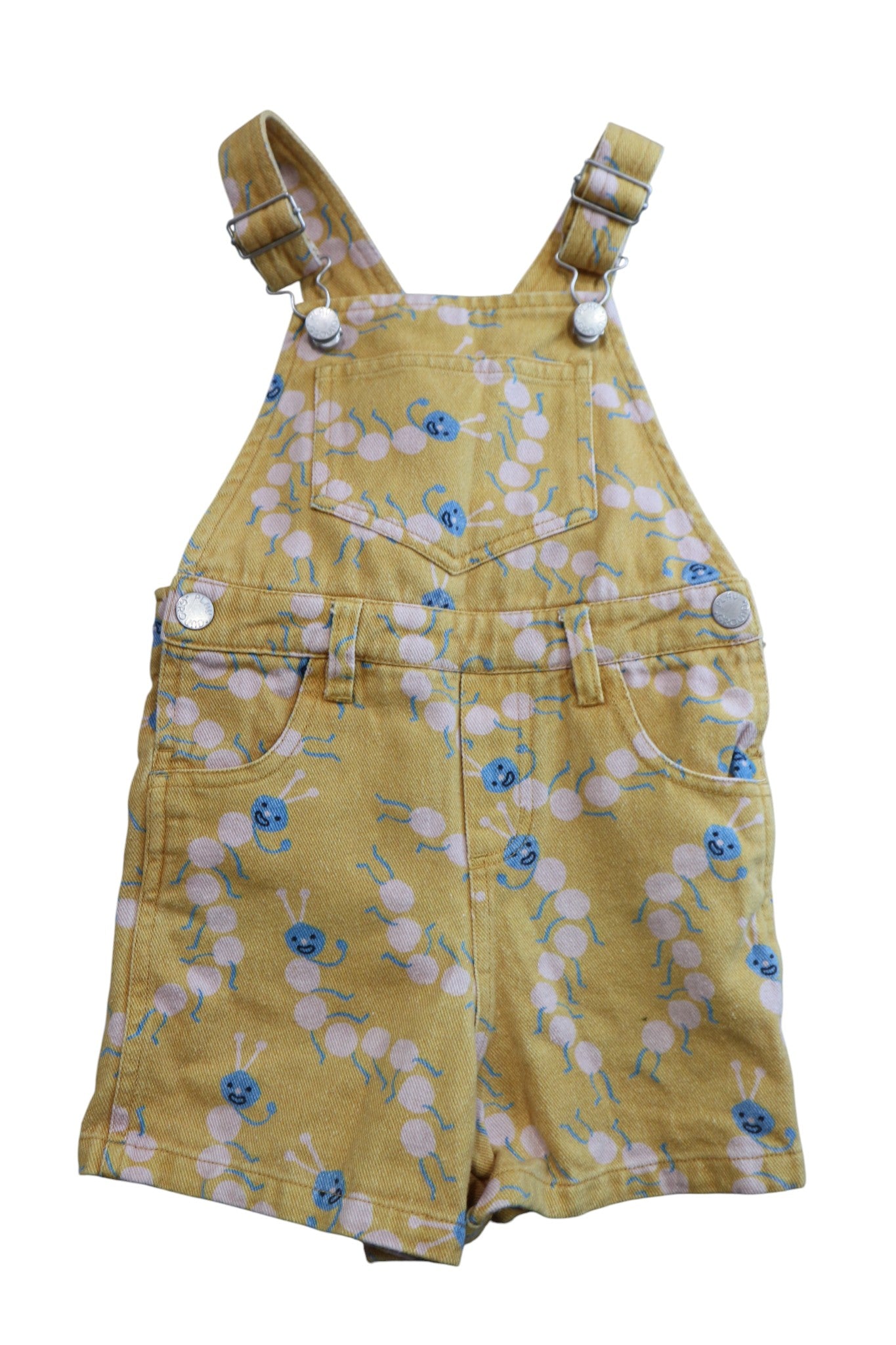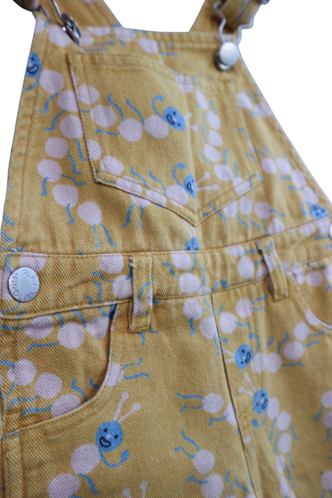 Gorman Playground denim shortalls in yellow with all over ant print, size 3-4yrs. 100% organic cotton.