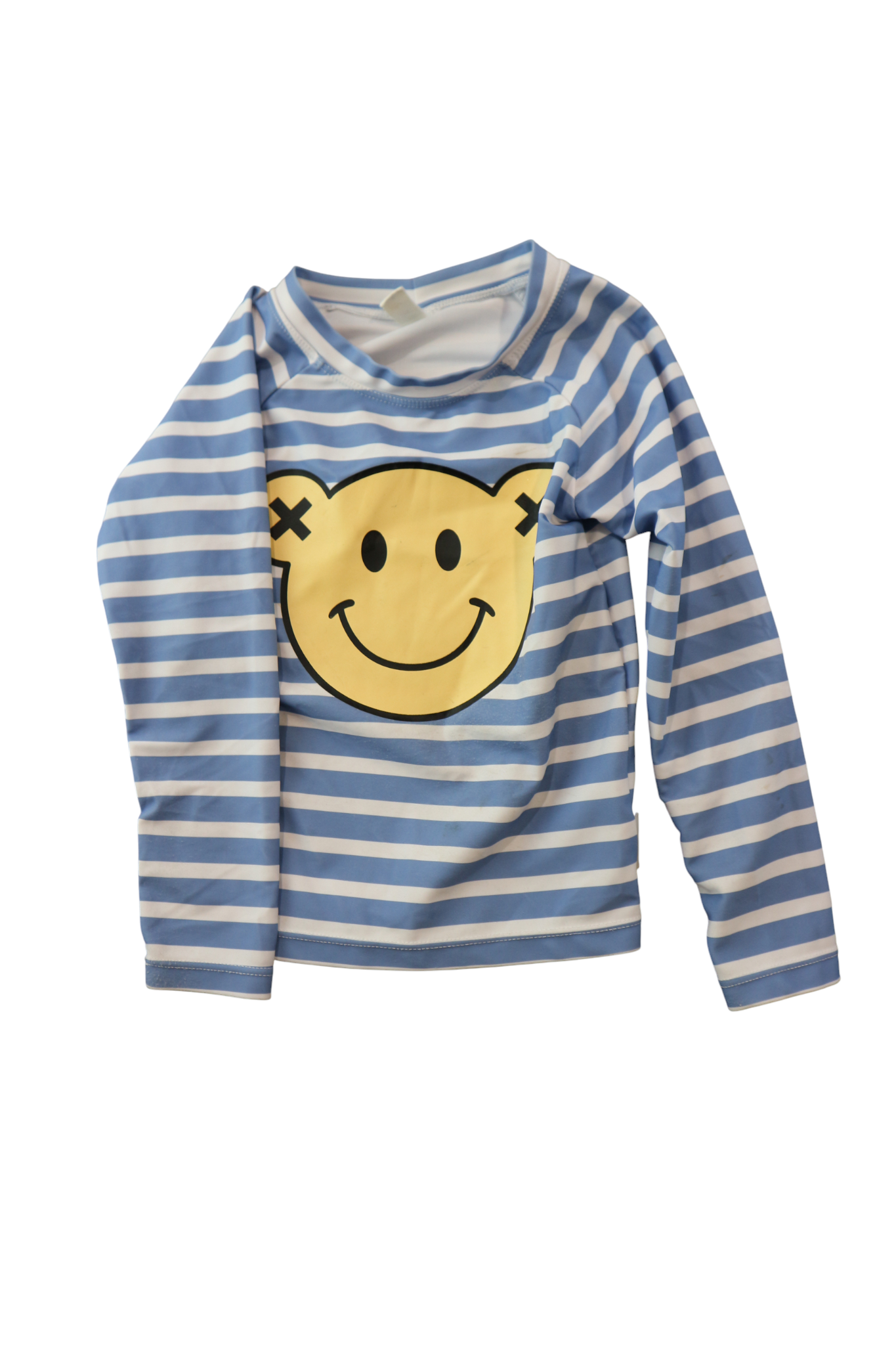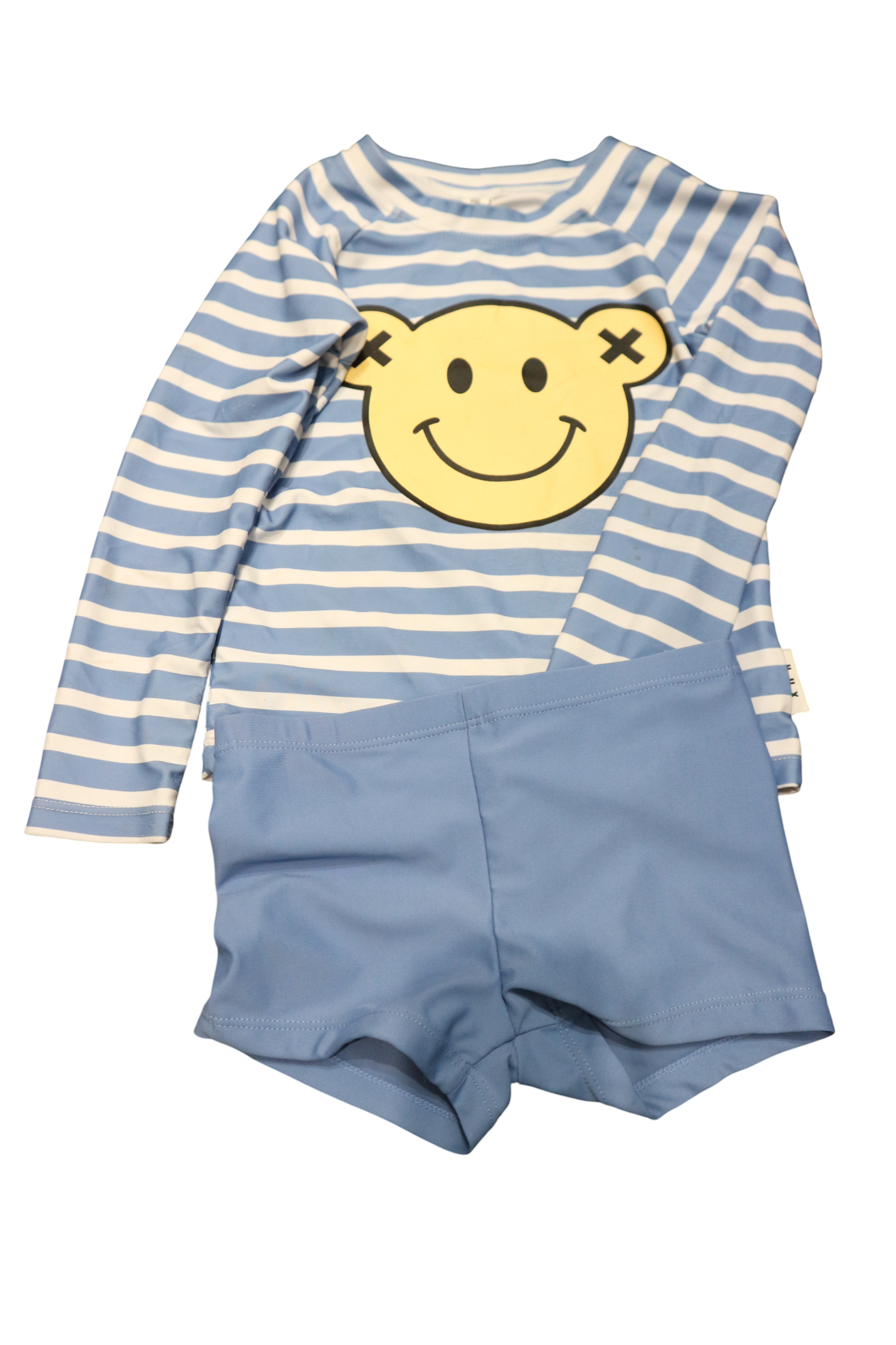 Hux rashie and swim trunks set in blue/stripe with smiley face print, size 4. Recycled polyester/elastane.