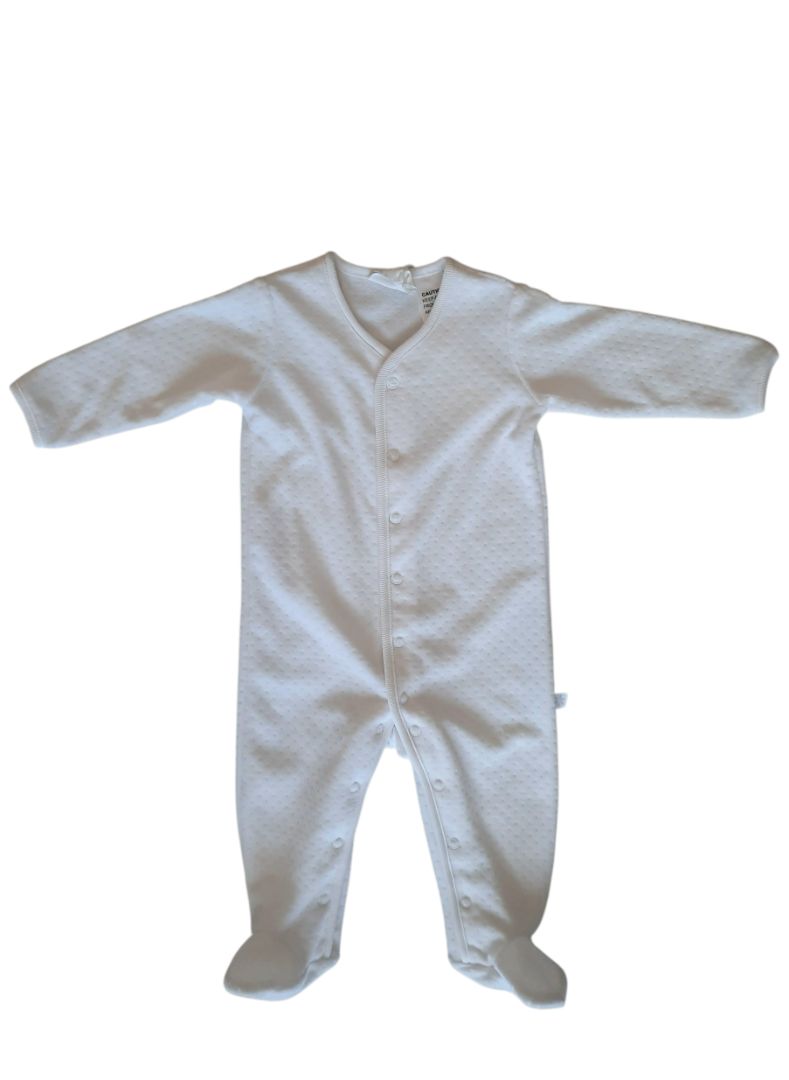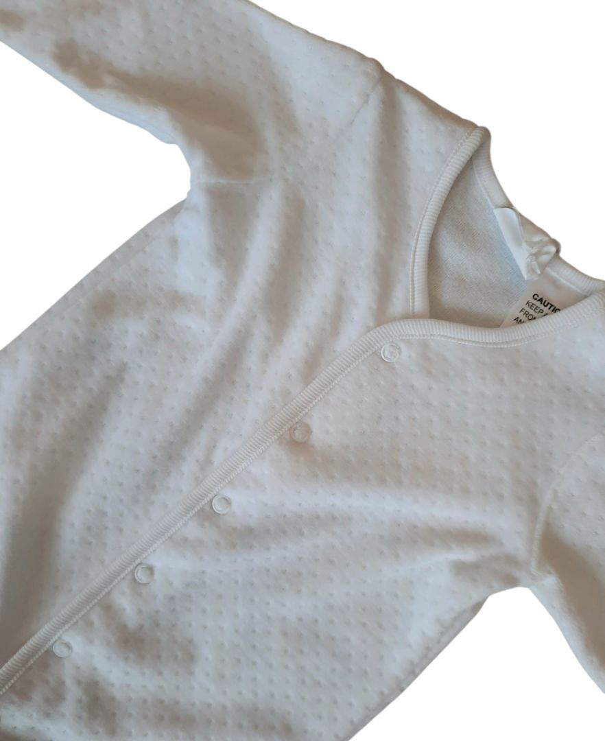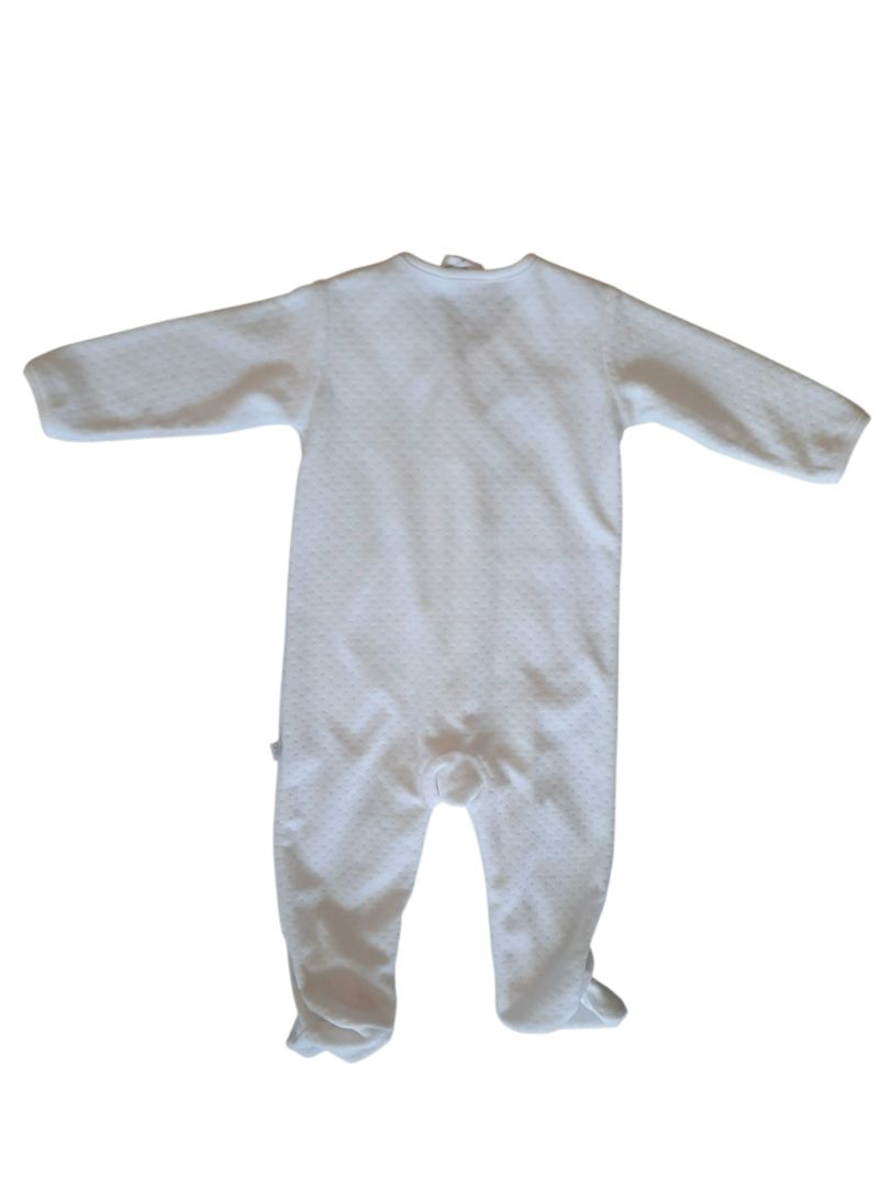 This white Marquise velour baby jumpsuit offers cosy comfort with its soft fabric and enclosed feet to keep your little one warm from head to toe. The convenient snap fasteners at the crotch make outfit changes quick and easy, perfect for busy parents. It’s an ideal choice to keep your baby snug and stylish all day long. Size 00.