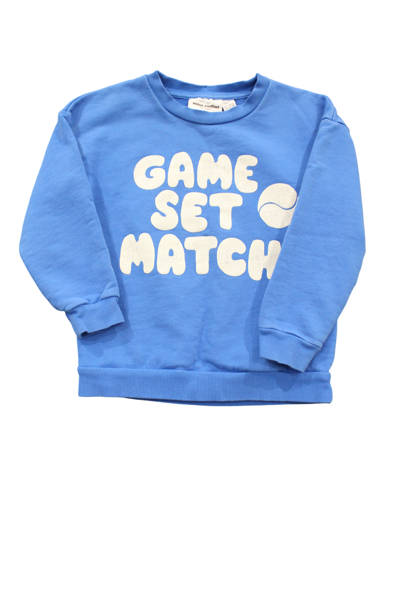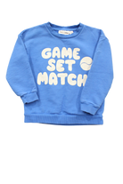 Get ready to ace playtime in this vibrant blue Mini Rodini jumper! Made from 100% pure cotton, it's soft, breathable, and built for active kids who mean business. The bold 'GAME, SET, MATCH' print brings sporty swagger to everyday adventures. Whether they're conquering the playground or just hanging out, this jumper delivers comfort and cheeky style in one winning package. Fair condition, some wash fade and print cracking slightly.