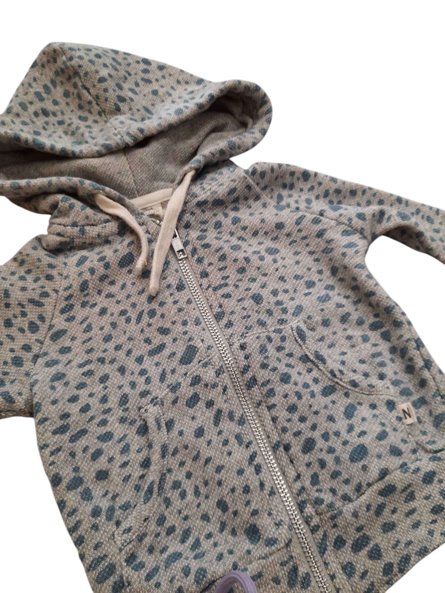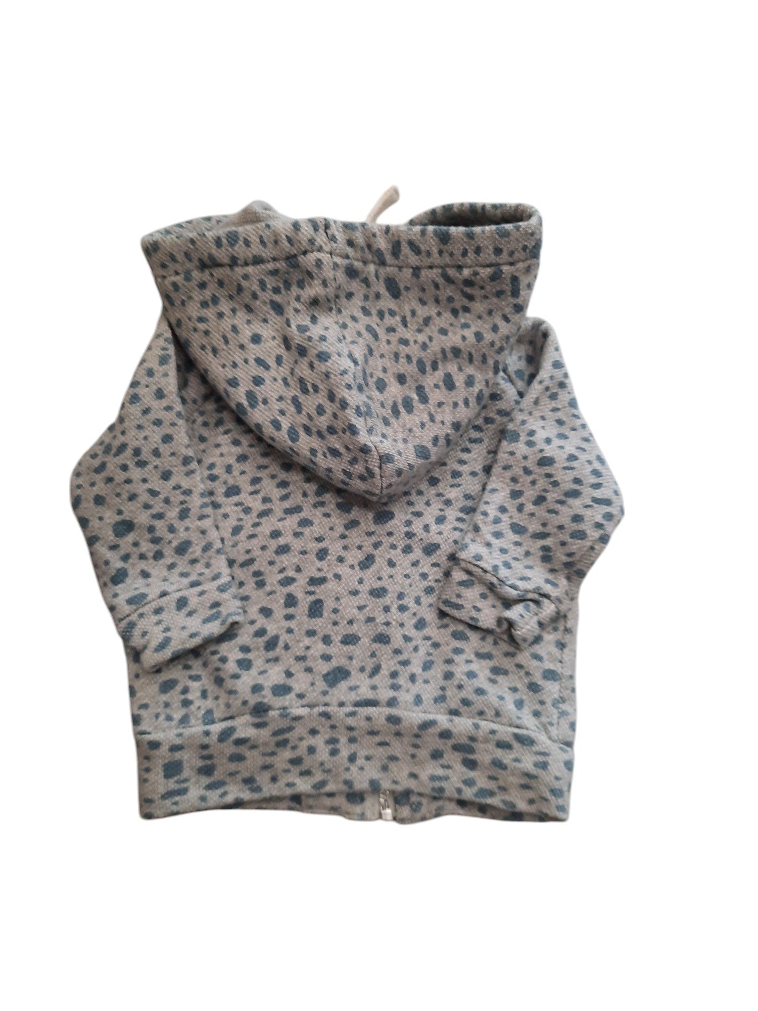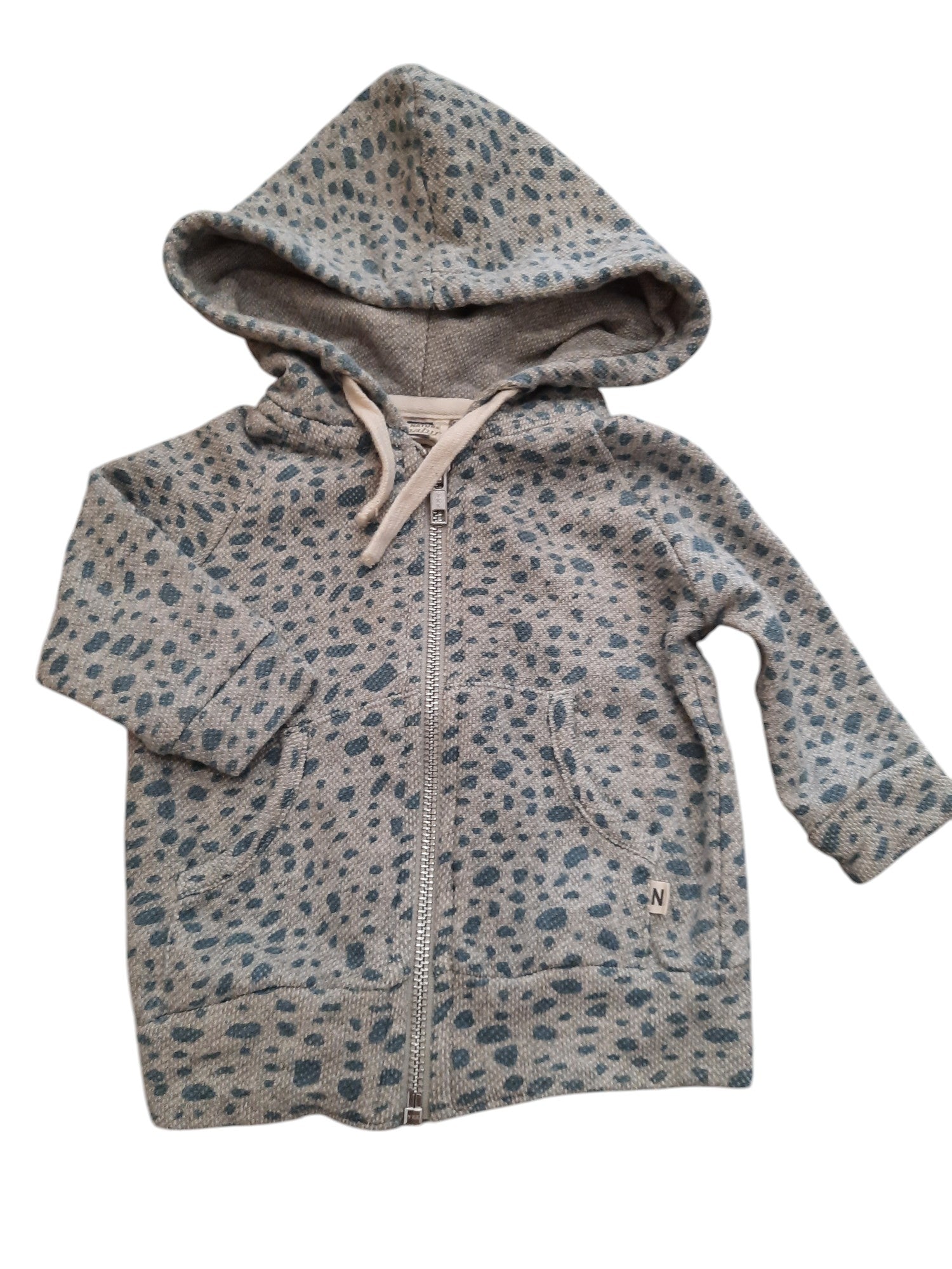 Nature Baby zip hoodie in grey with blue print, size 00. 100% organic cotton.