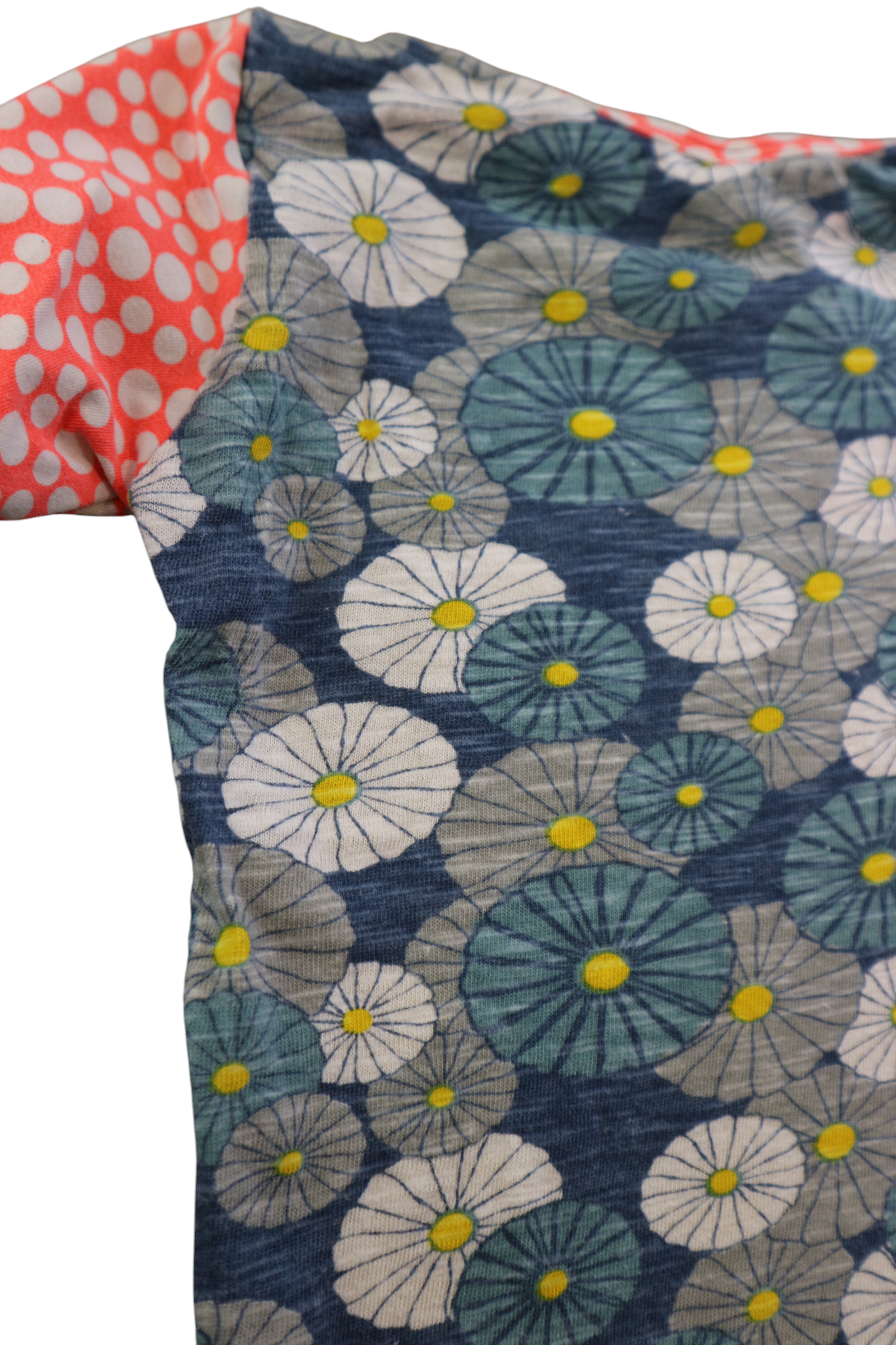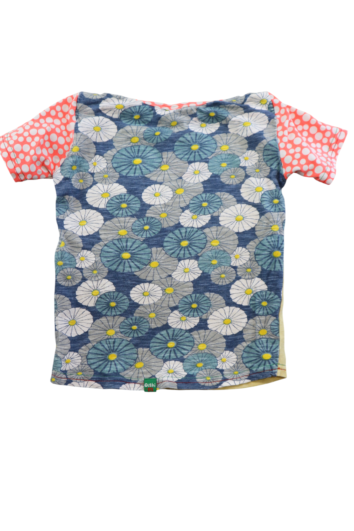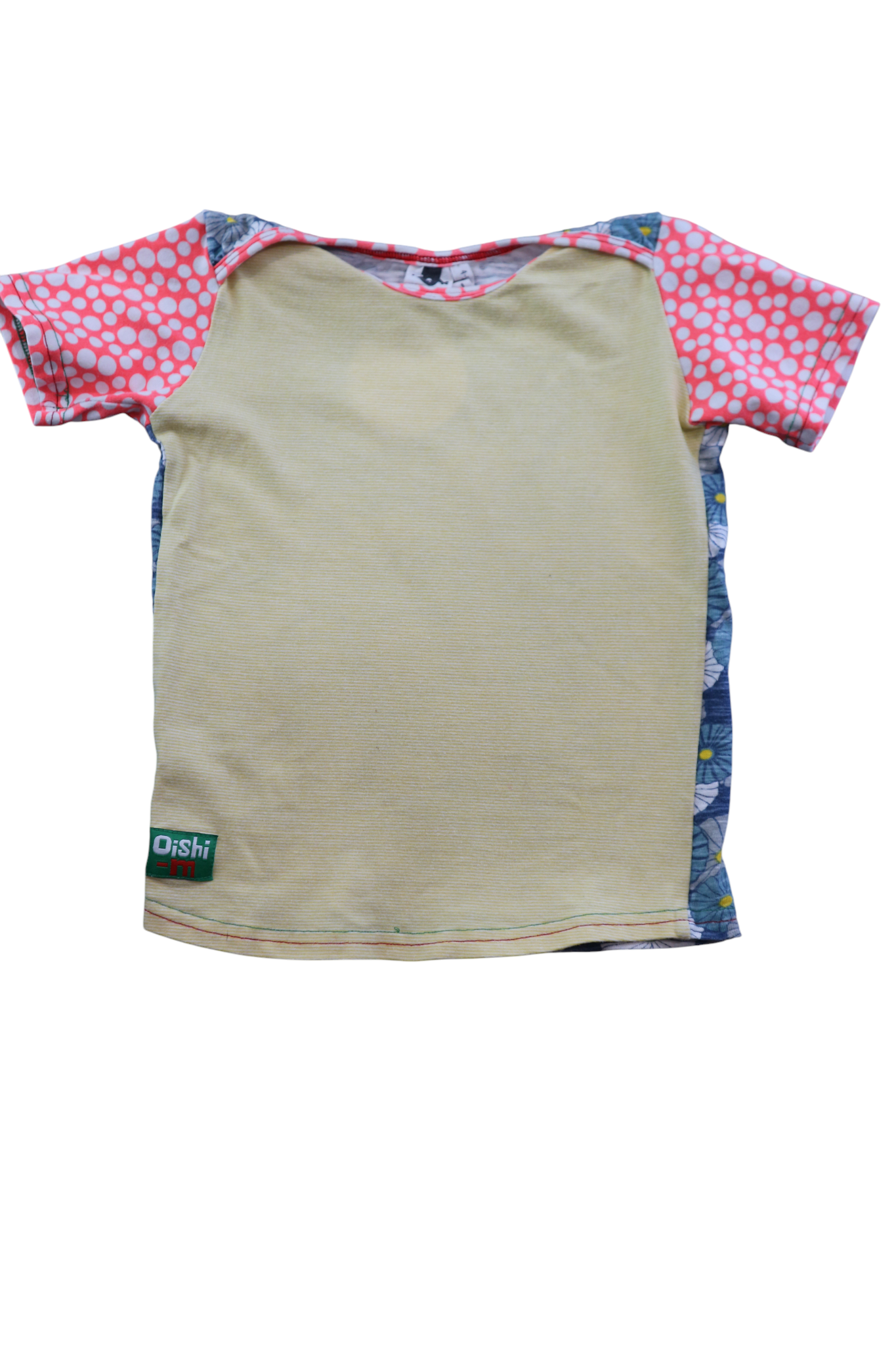 Oishi-m yellow stripe, floral and spot print tee in size 4-5yrs. Cotton/elastane.