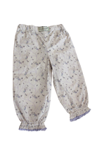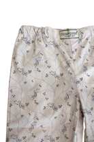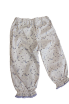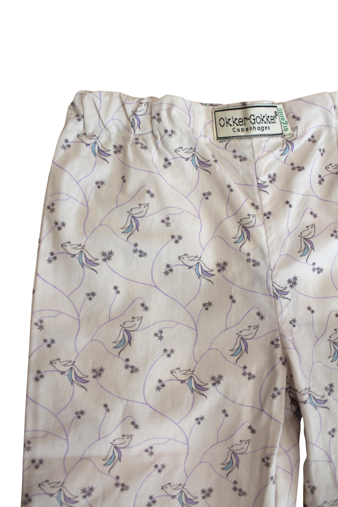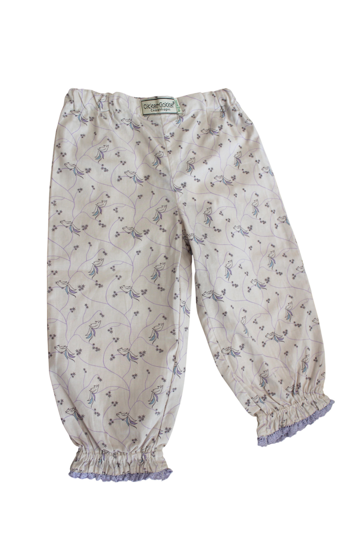 lightweight panteloon style pants from an amazing Copenhagen Brand. with an elastic waist and an inner button for adjusting fit. perfect for comfort and play. A sweet bird print and lace details, and an elastic hem on the pant leg.
