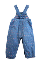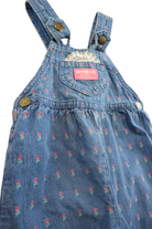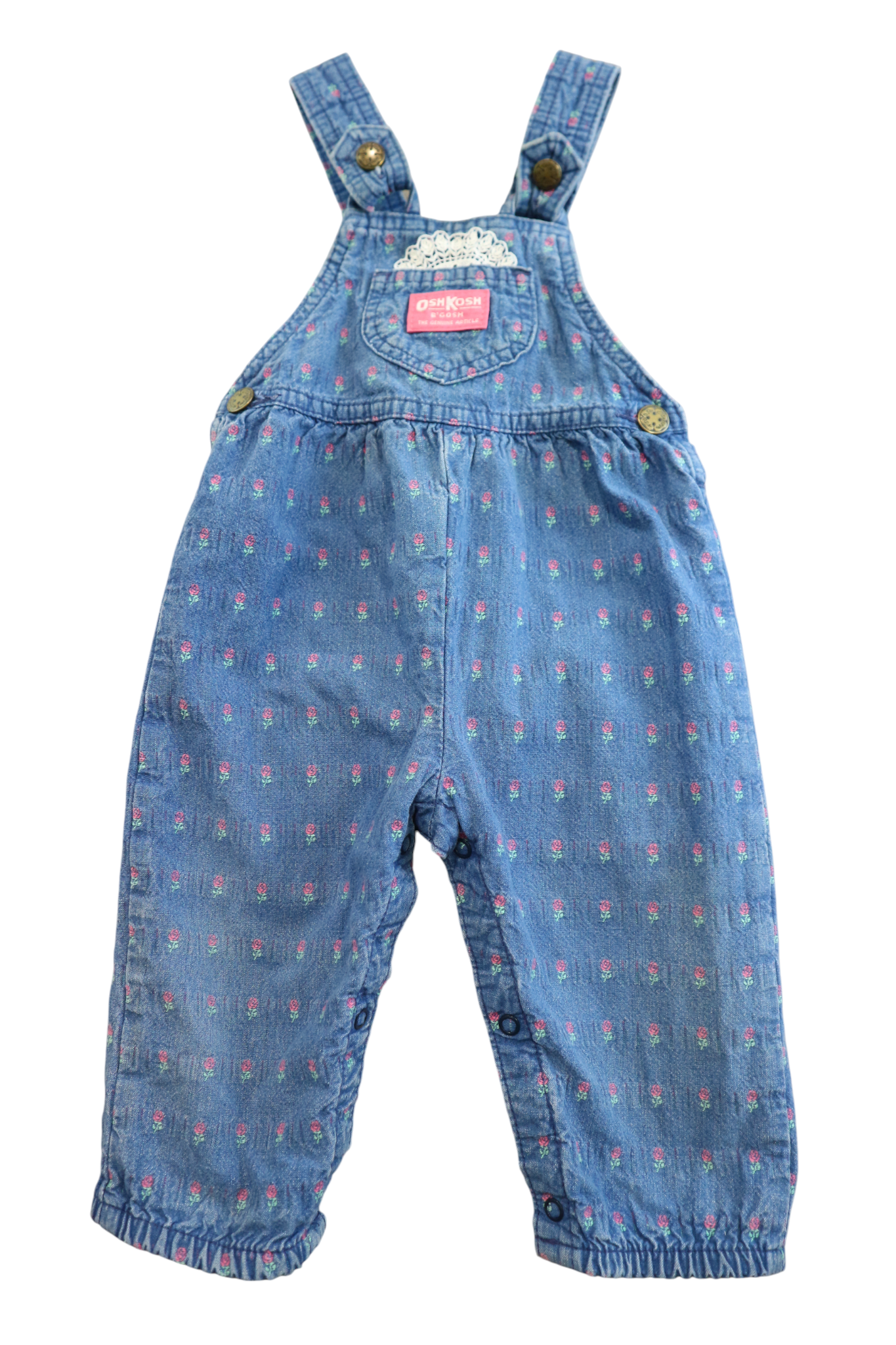 OshKosh blue denim overalls with all-over rose print, lace pocket and rear bow, size 18m (1yr). 100% cotton. Made in USA.