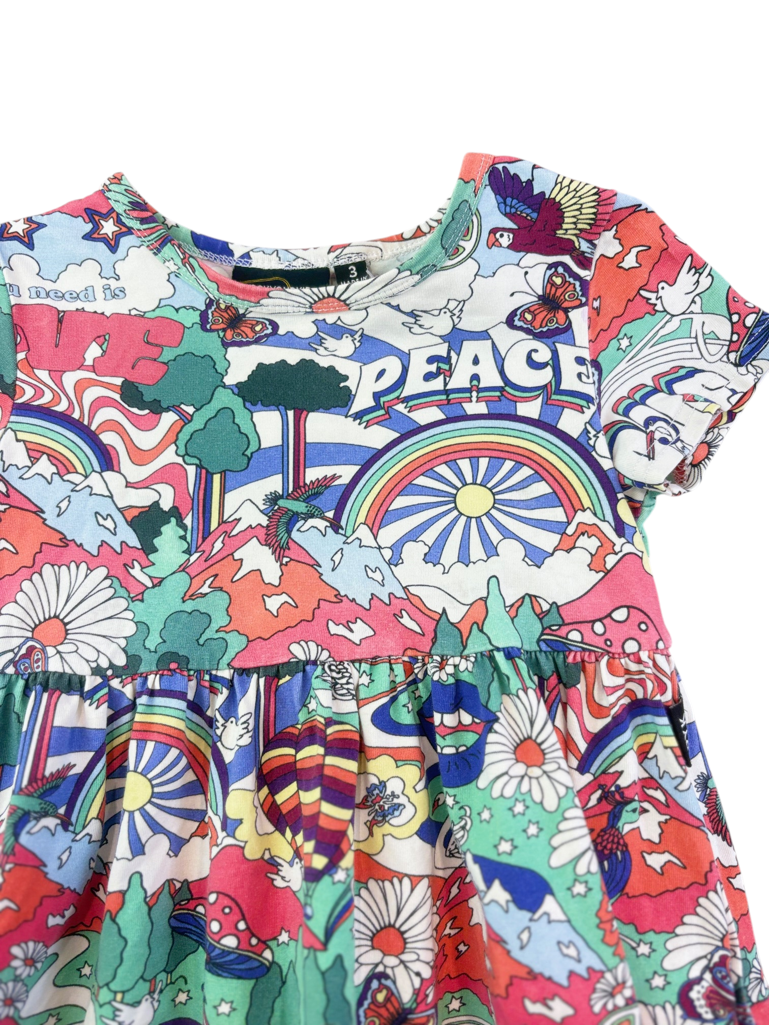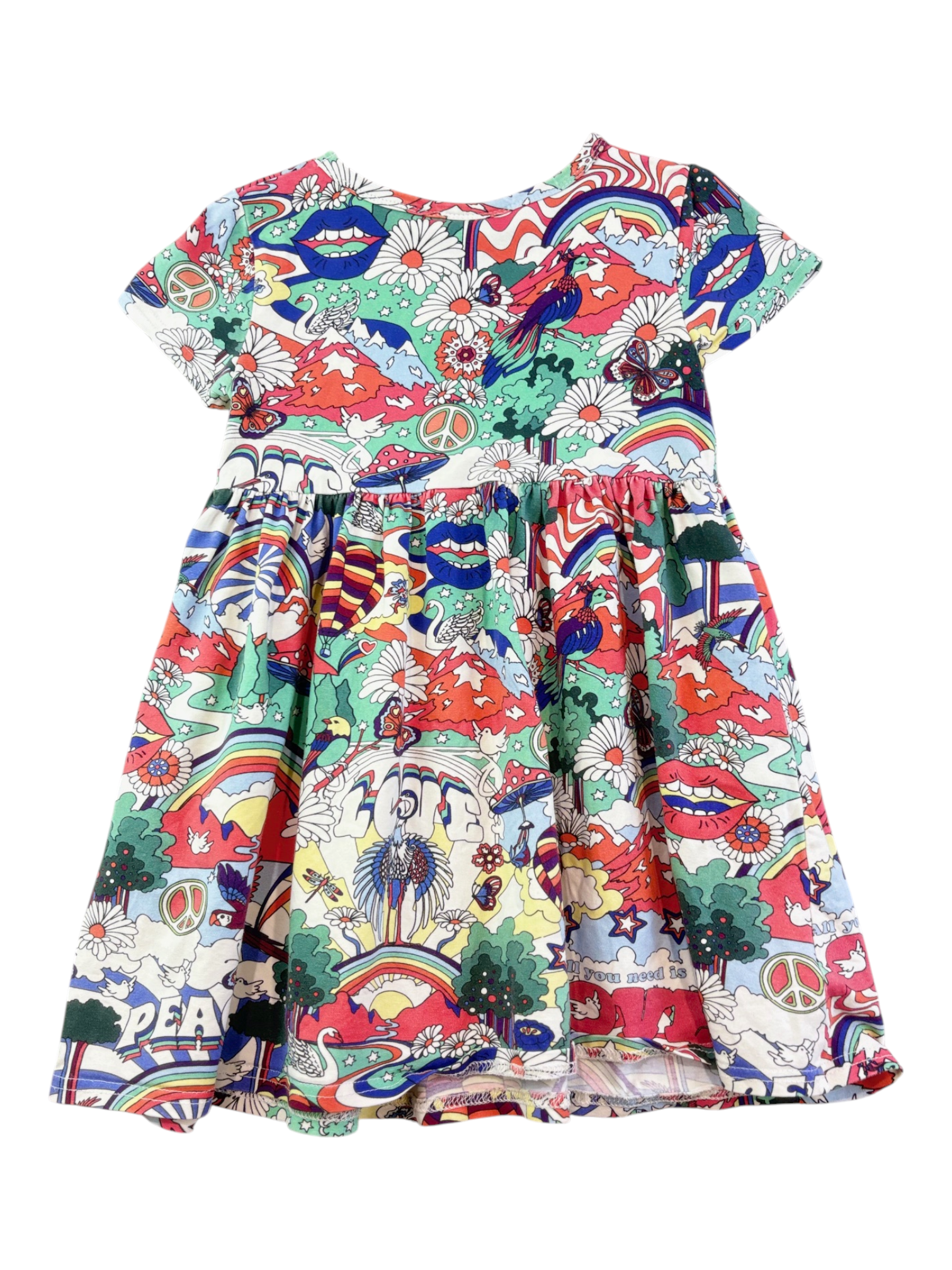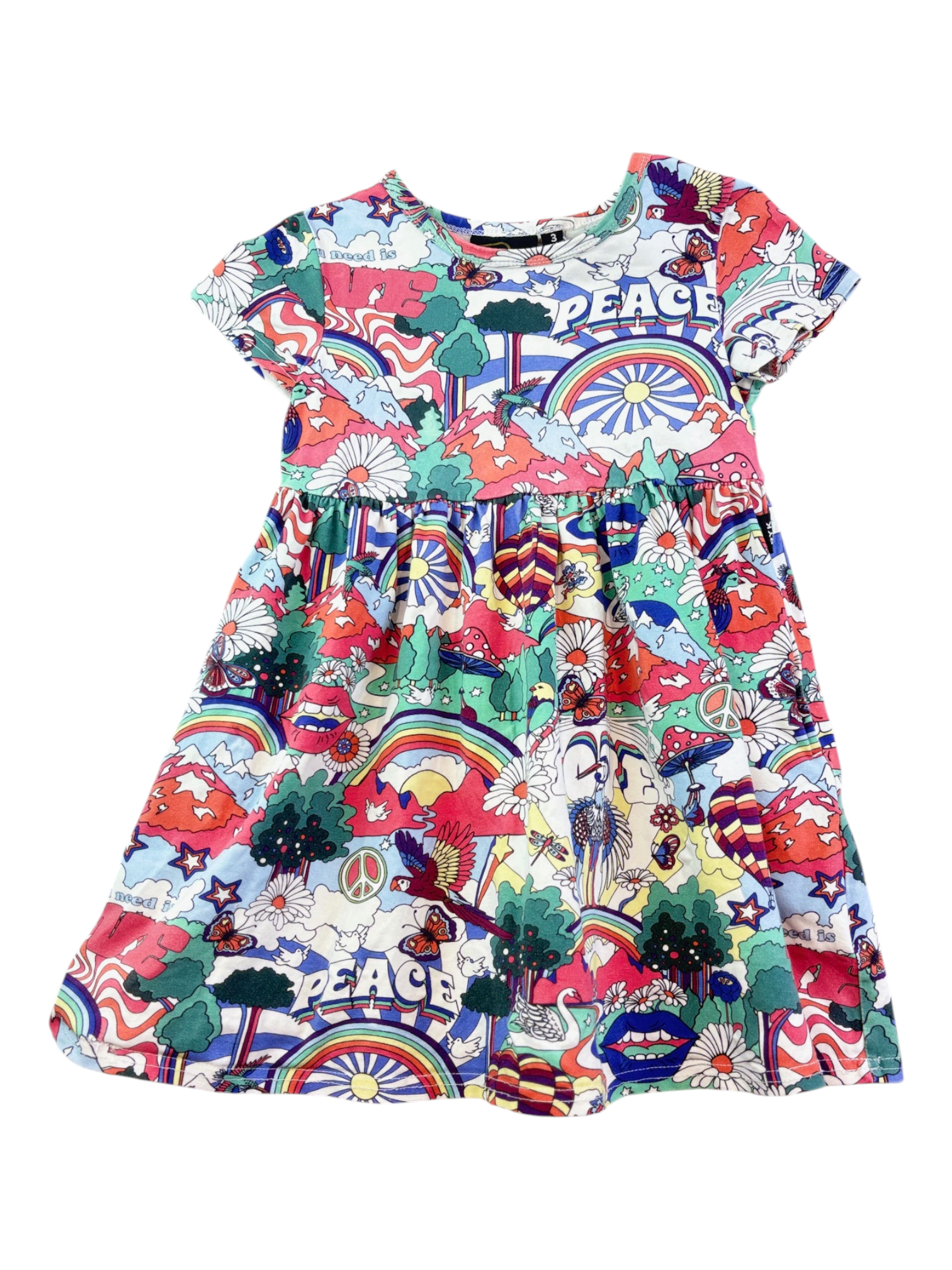 Embrace summer in this vibrant Rock Your Kid dress bursting with super colourful retro peace print! The soft, lightweight cotton and elastane blend is super stretchy, making it perfect for active kids who love to play. Short sleeves keep things cool, while practical pockets are ideal for stashing treasures.