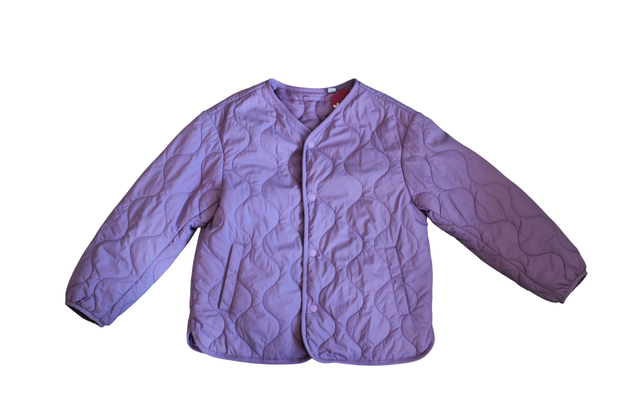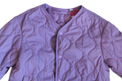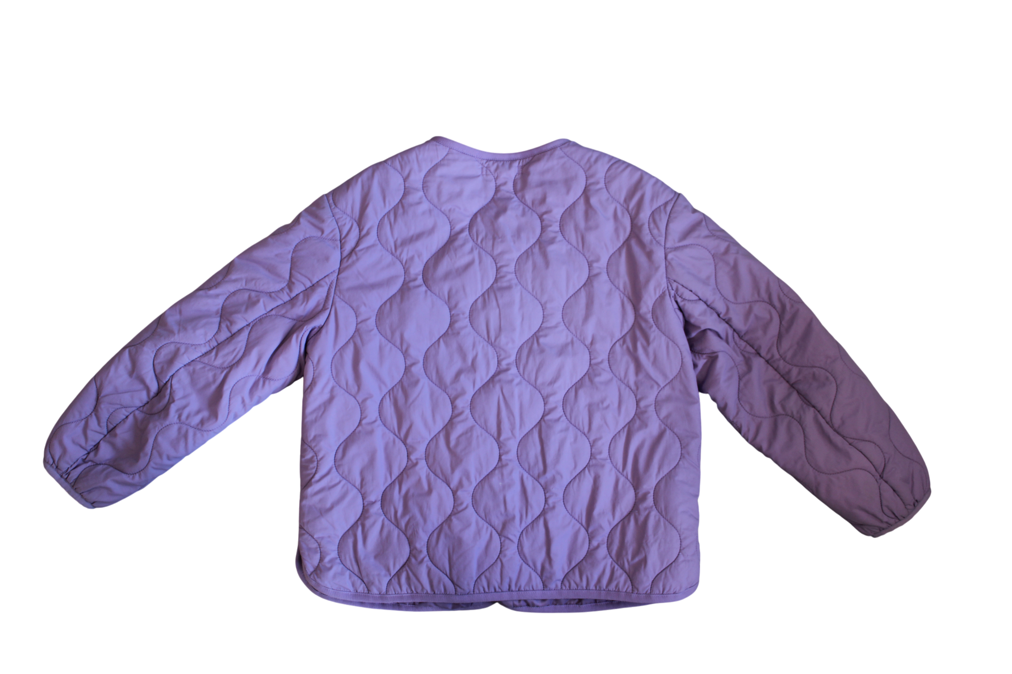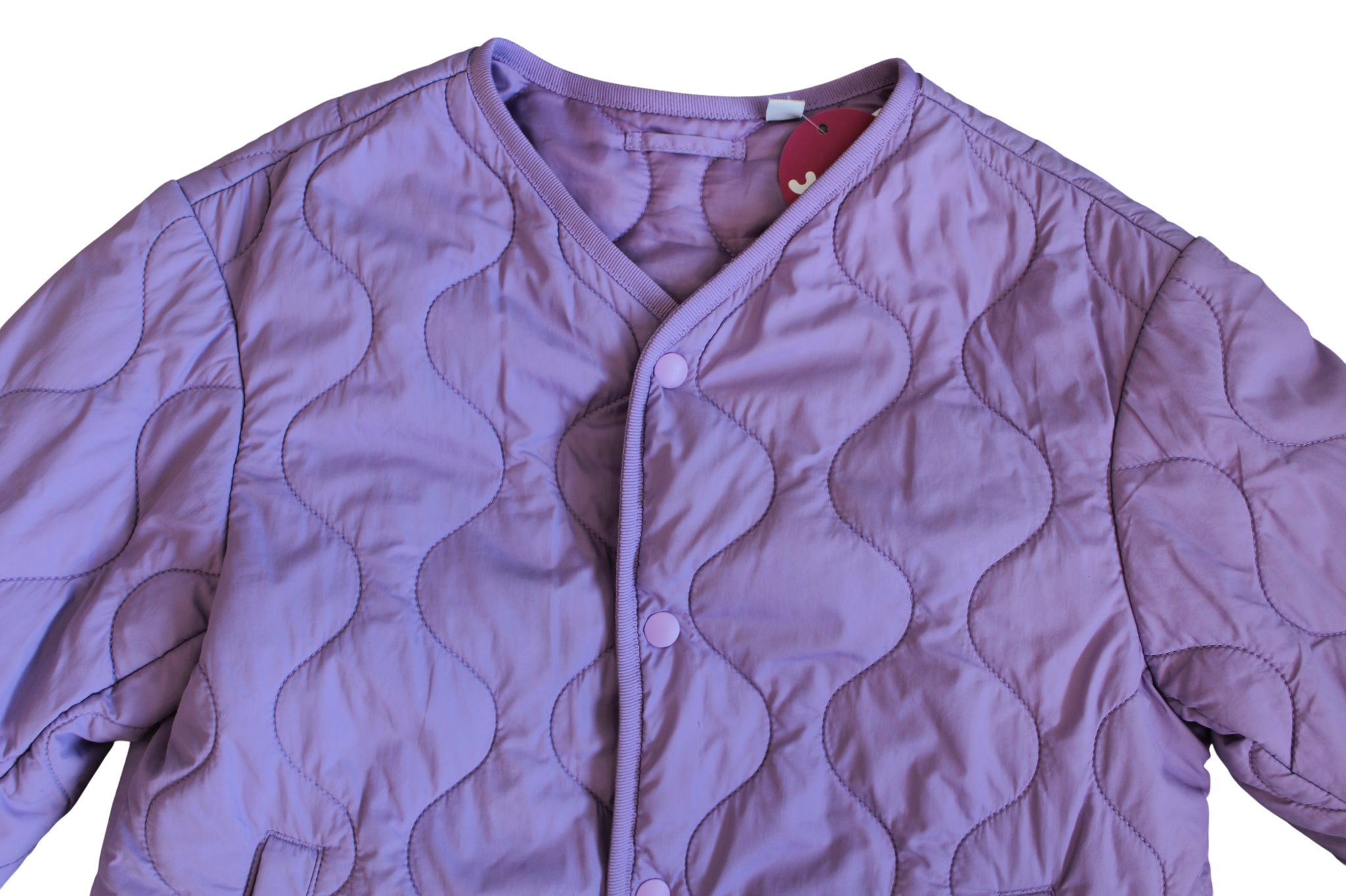 Light-Weight quilted Doom front opening. Bound neckline and sleeve finishing with two front pockets.