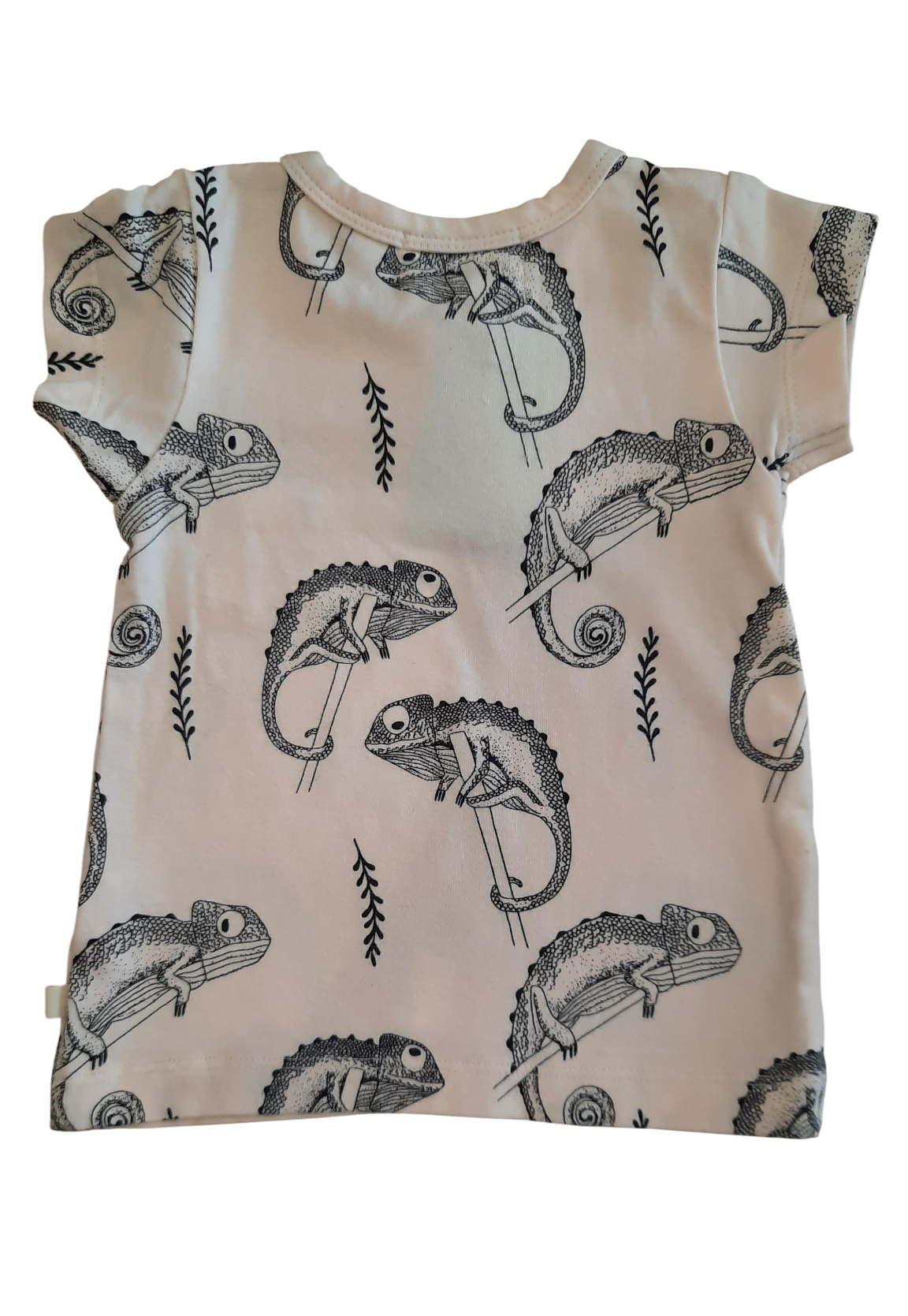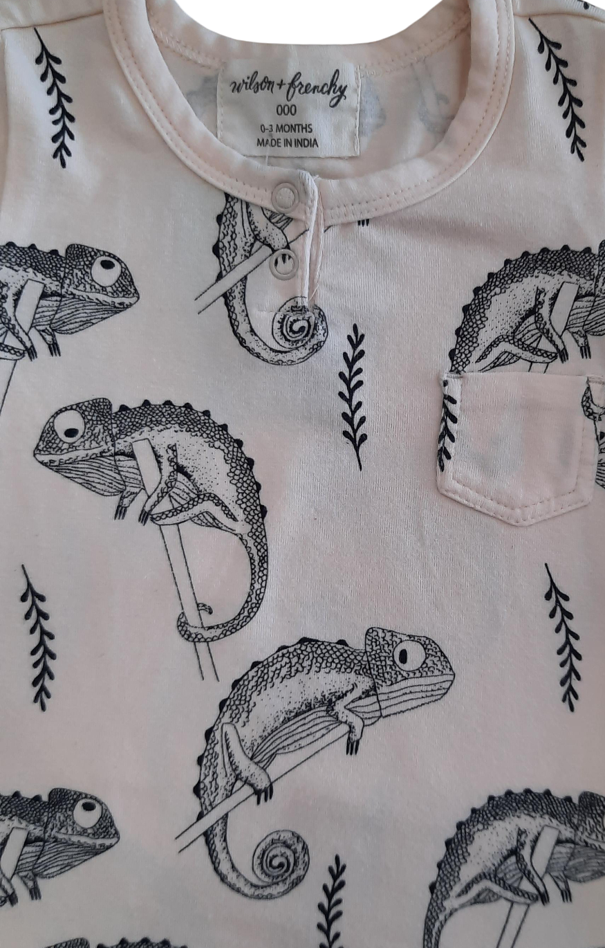 Meet your new baby essential: a cream Henley tee with a playful chameleon print. Wonderfully soft and stretchy thanks to organic cotton, bamboo and elastane composition, it's designed for tiny comfort in size 000. Excellent condition.